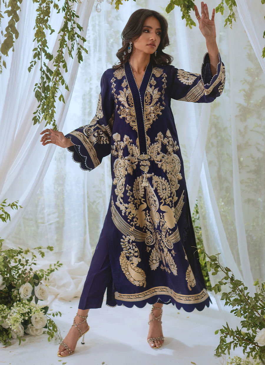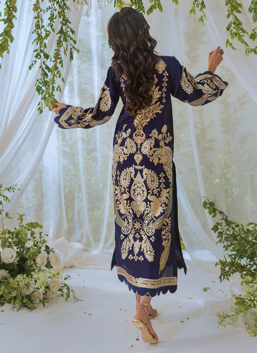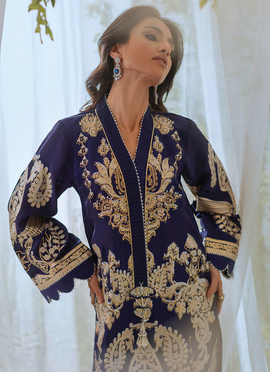 Long silhouette shirt in deep midnight blue shade on silk canvas featuring silver and gold composed screen printed details. The neckline is enhanced with fabric manipulation details adorned with handcrafted dangling tassels. The shirt comes with matching straight pants.