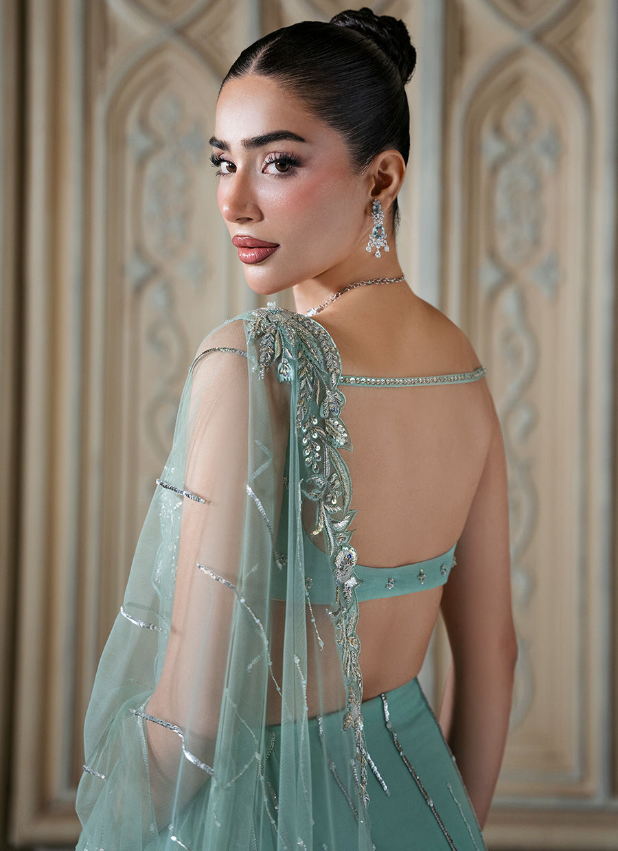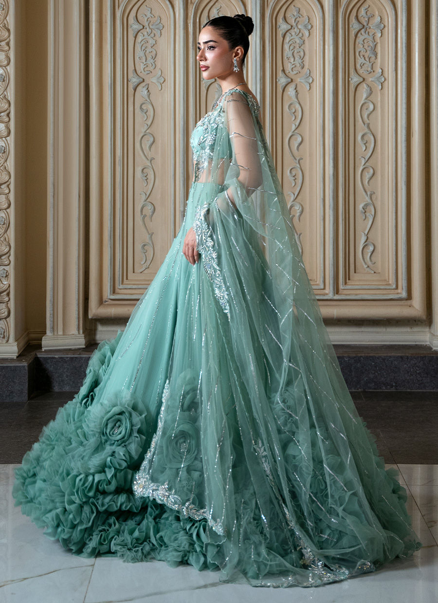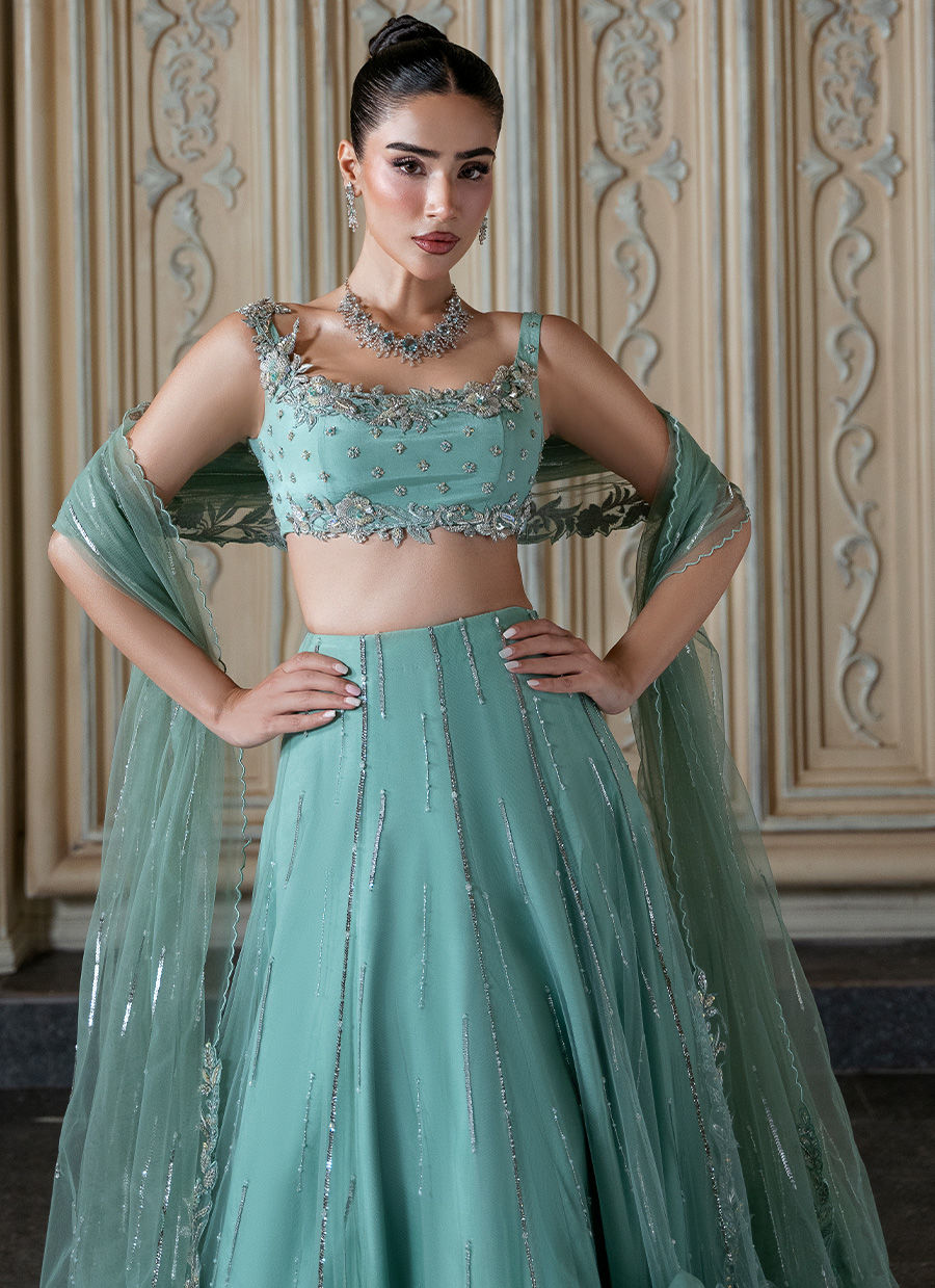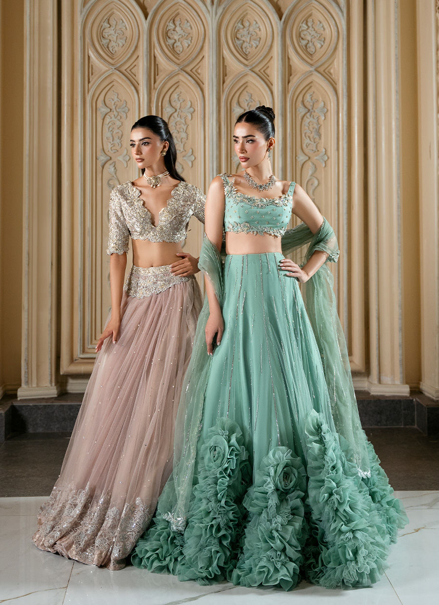 An epitome of grandeur, the Aqura Rose Lehenga Choli is the perfect choice for the wedding season. The delicately hand-embellished choli is paired with an extravagant ruffle skirt, adorned with floral detailing and beads that bring a touch of luxury and glamour. The look is completed with a matching net dupatta featuring intricate hand embellishments, making it a true statement piece for every bridesmaid.