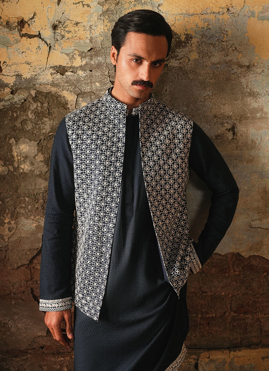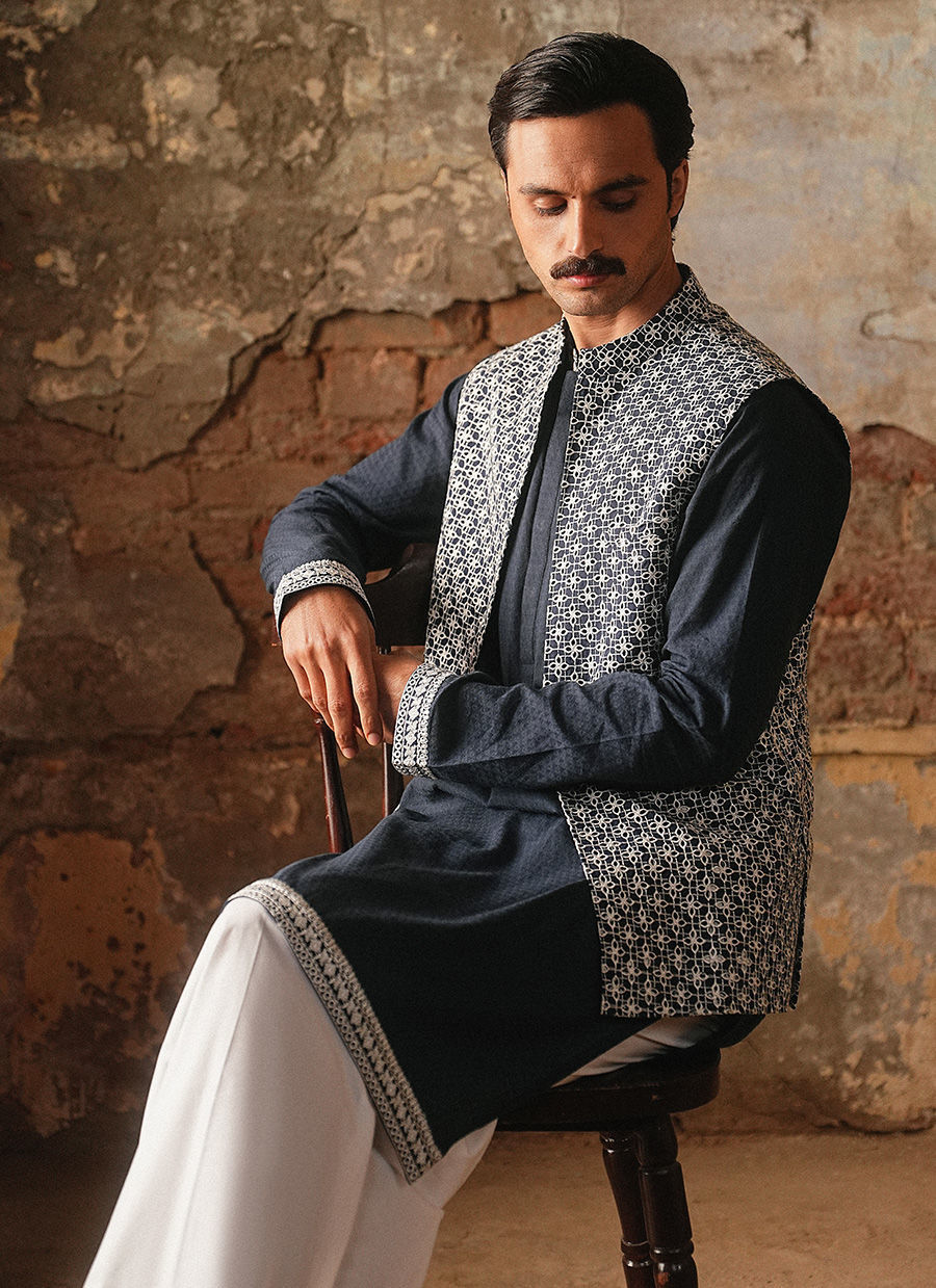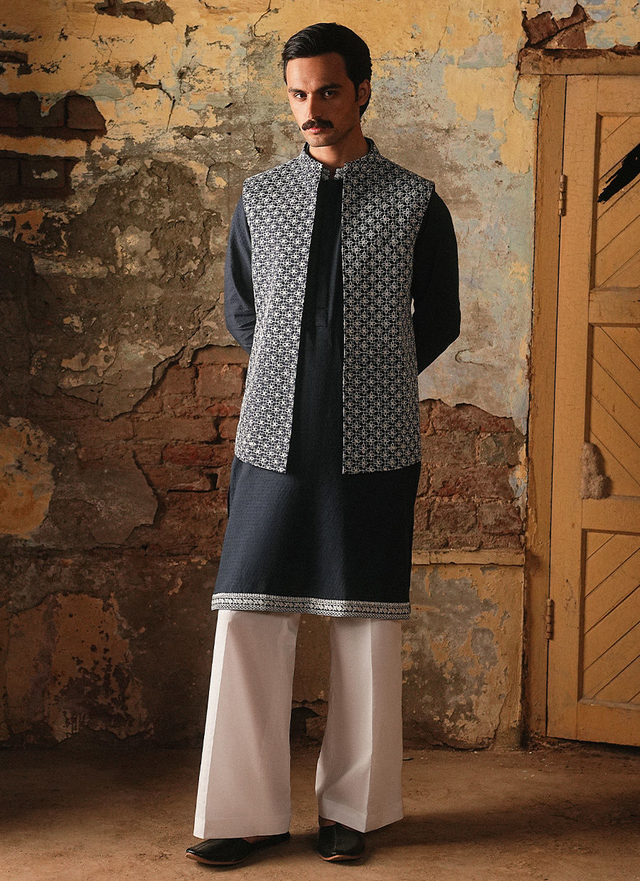 This stylish three-piece ensemble is crafted from soft and breathable cotton lawn, ensuring comfort and ease of wear. The waistcoat features a striking geometric jaal repeat, adding a contemporary touch to the outfit, while the kurta is enhanced with a refined border for an elegant finish. Paired with loose-fitting trousers, the ensemble offers a relaxed silhouette without compromising on style—perfect for casual gatherings or semi-formal occasions.