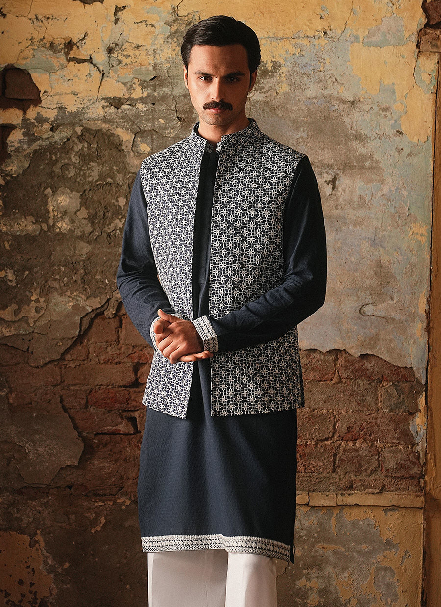 Color: Navy Blue Fabric: Cotton Lawn Work Details: Geometric Jaal Repeat on Waistcoat
