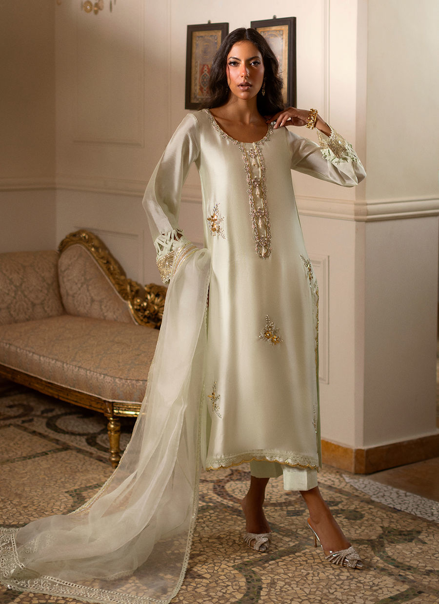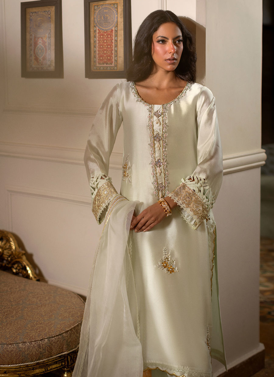 Arina - Long silhouette shirt on glistening silk canvas featuring carefully crafted zardozi neckline silver and dull gold accents. The centre front is enhanced with gold kaamdani motifs. The outfit is paired with matching organza dupatta and raw silk pants to complement the look.