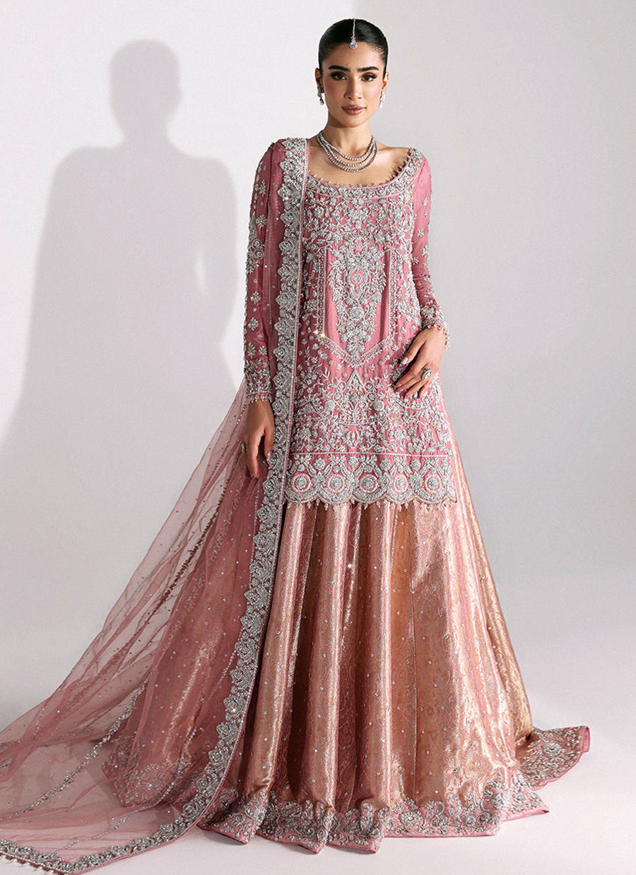 A striking deep pink ensemble featuring a short net shirt and a matching net dupatta, both intricately embellished with heavy zardozi work. The look is paired with a richly woven jamawar lehenga, accentuated with elegant borders that add depth and grandeur. Perfect for festive occasions and wedding events, this design blends traditional artistry with bold, timeless charm.