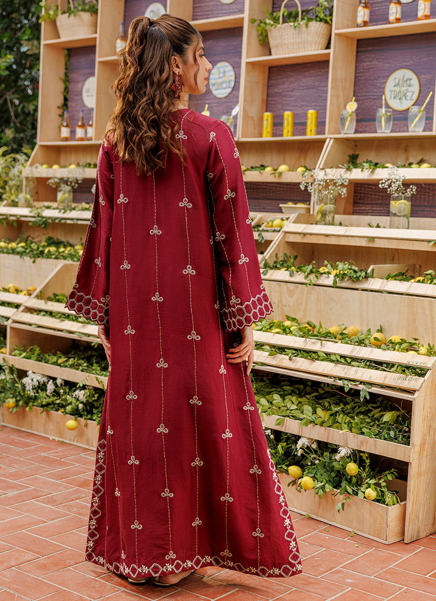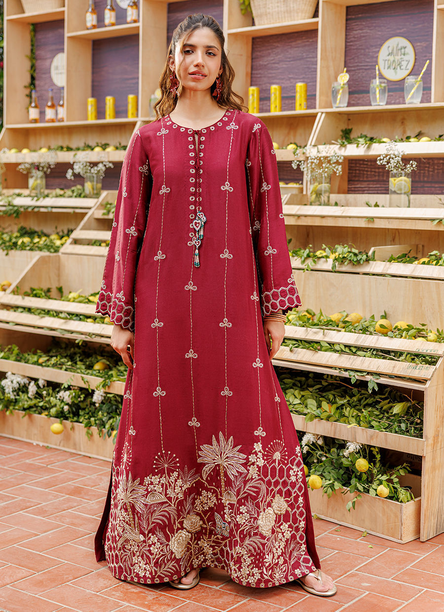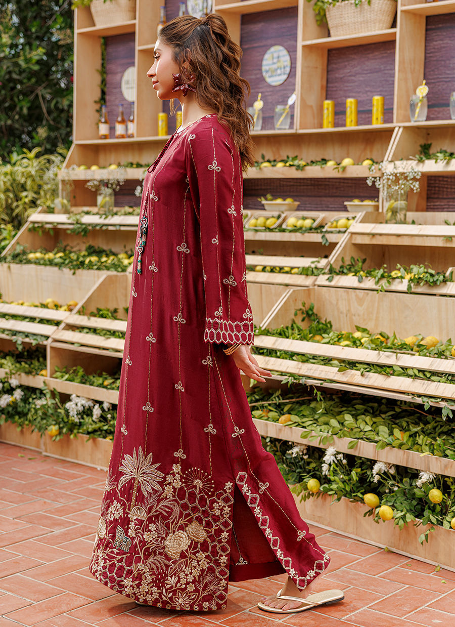 This deep maroon raw silk kaftan combines traditional artistry with a contemporary silhouette. Intricate resham embroidery meets classic block printing, elevated by meticulously handcrafted embellishments and a signature neck tassel. A luxurious statement piece that balances bold color with artisanal detail for an effortlessly regal look.