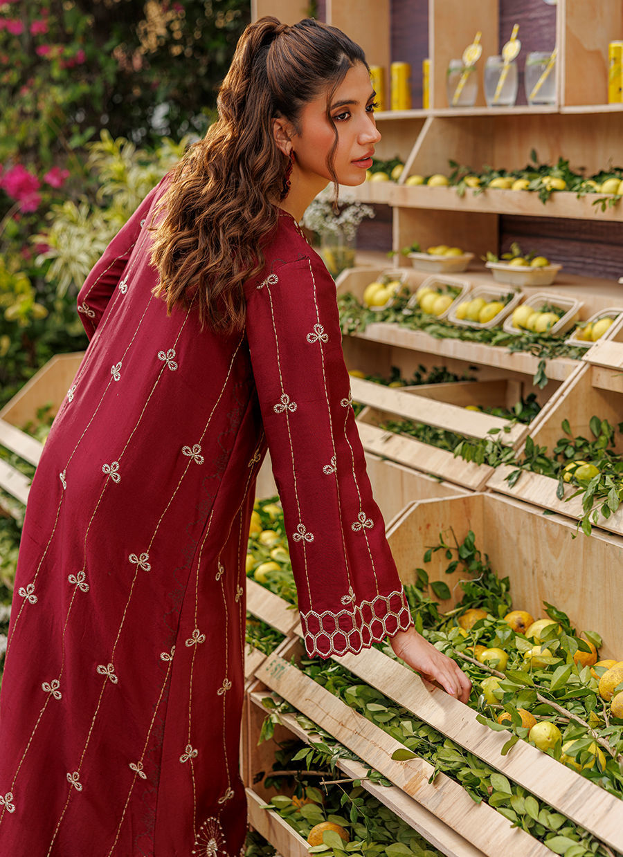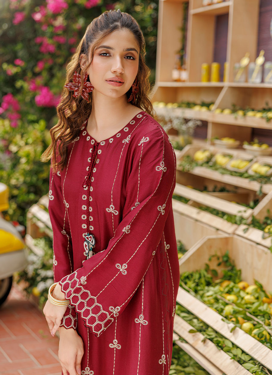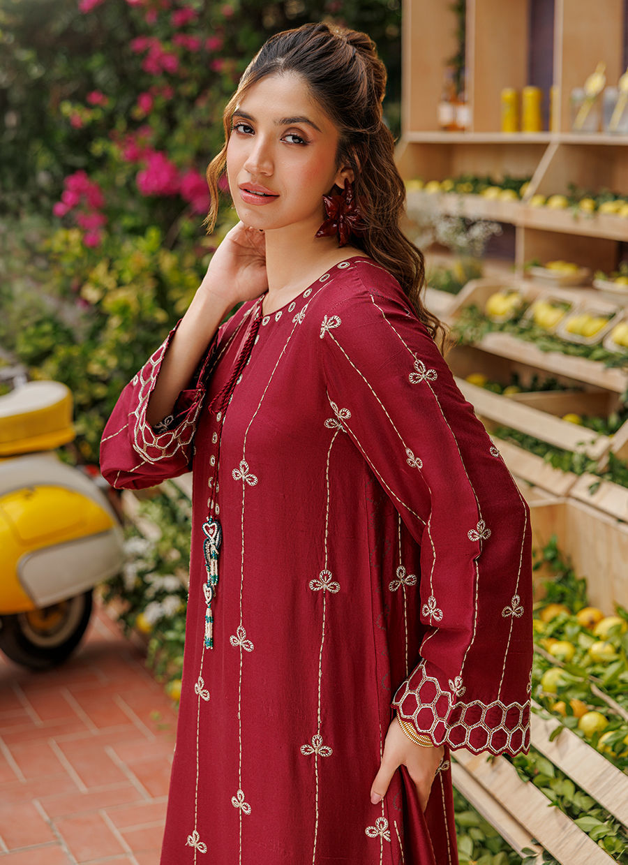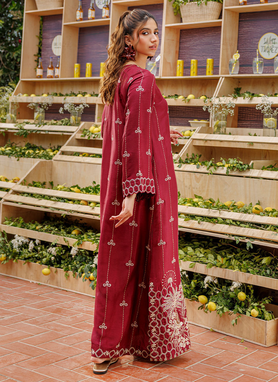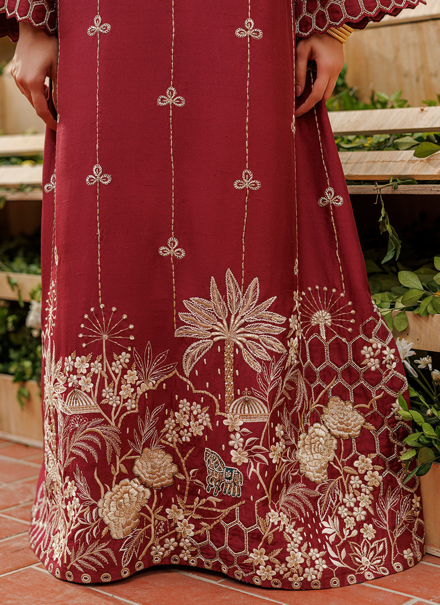Color: Maroon Fabric: Raw Silk Work Details: Embroidered