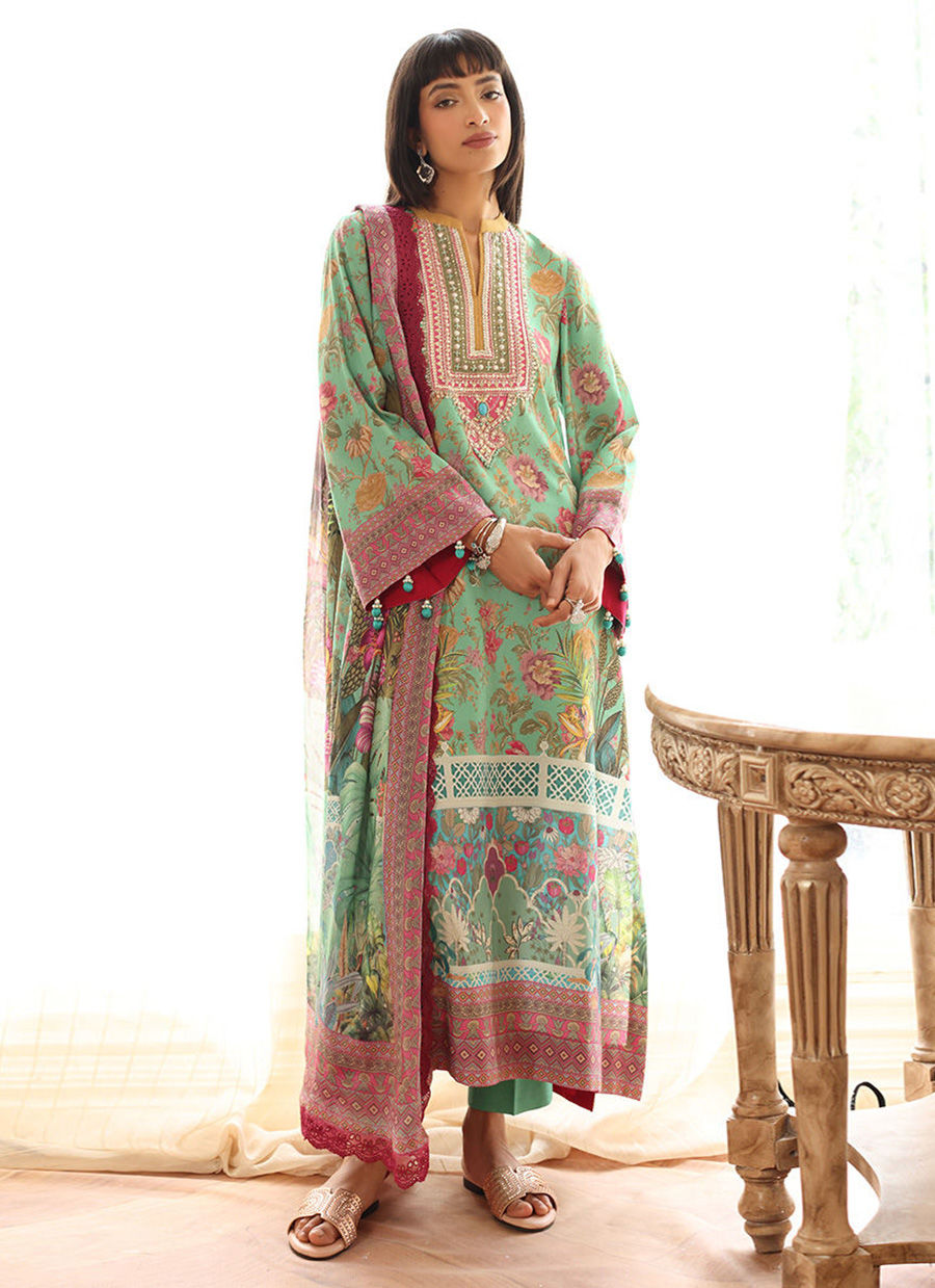 Color: Green Fabric: Shirt: Silk, Dupatta: Pure Medium Silk, Trousers: Korean Silk Work Details: Embroidered And Printed