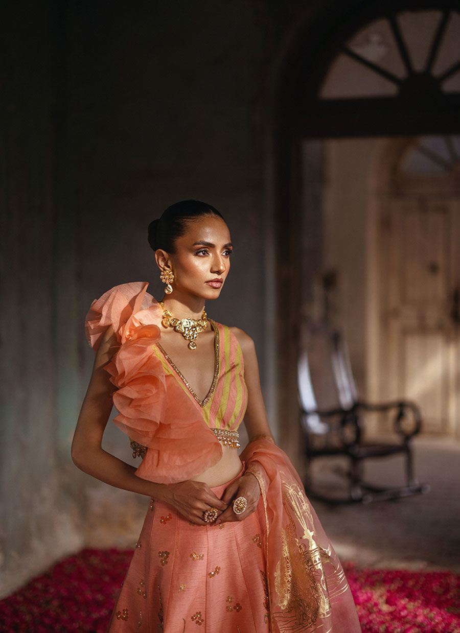 This stunning ensemble features a peach and green chatta patti blouse adorned with intricate 3D organza ruffles, creating a dynamic and elegant look. The blouse is paired with a beautifully screen-printed lehenga that showcases detailed embellishments of pearls and crystals, adding a touch of opulence. Completing the outfit is a shaded, golden screen-printed dupatta, which drapes gracefully and enhances the overall sophistication of the attire.