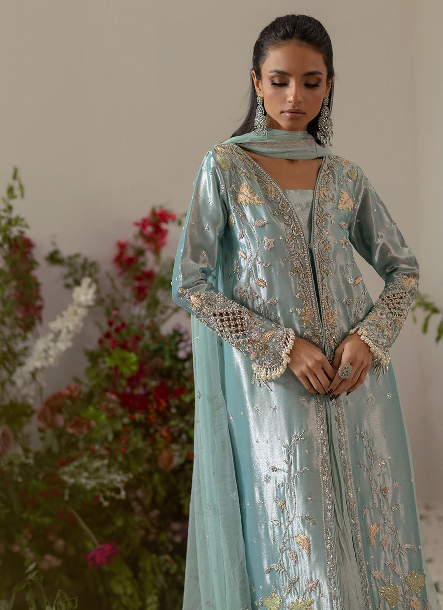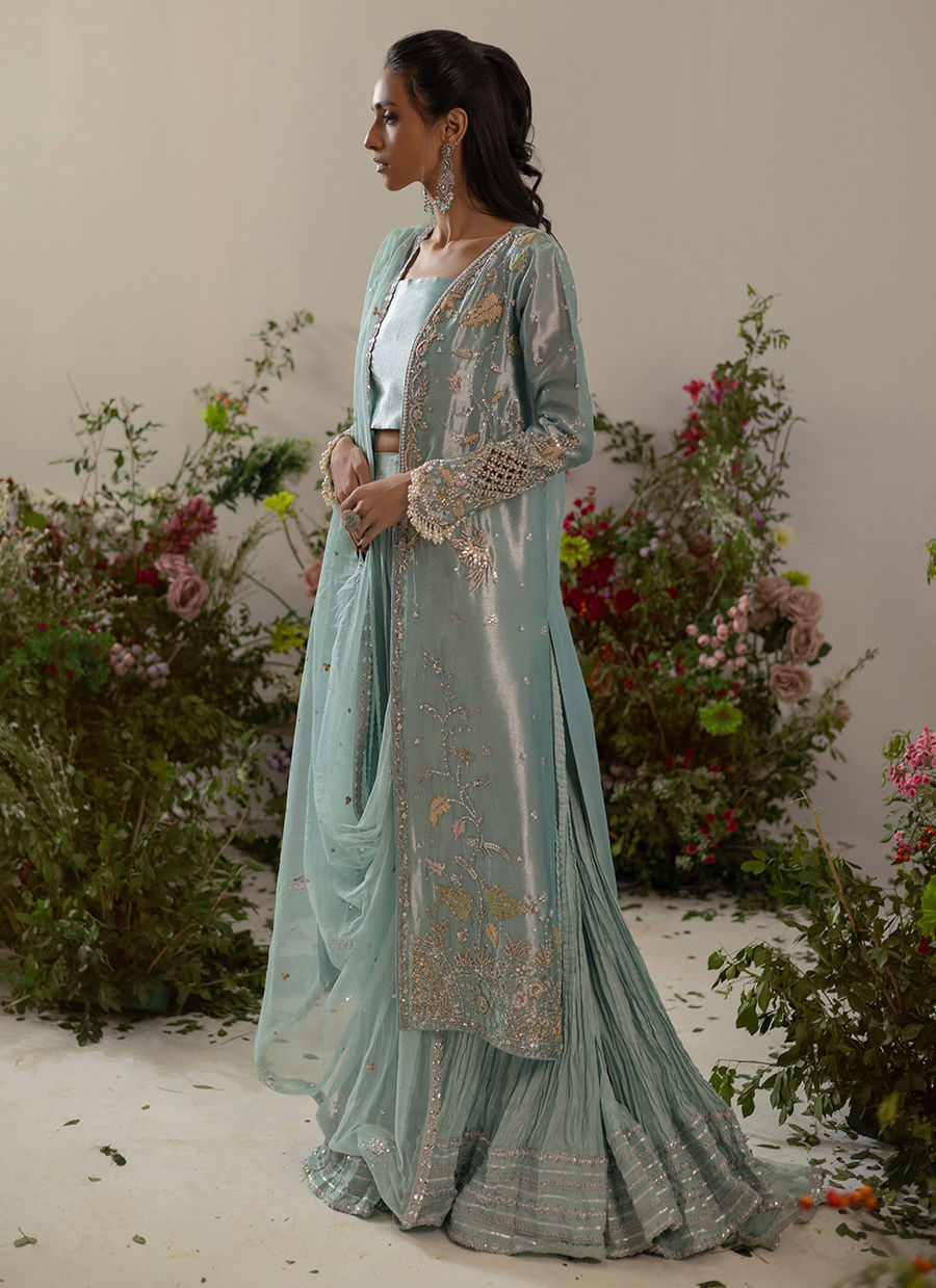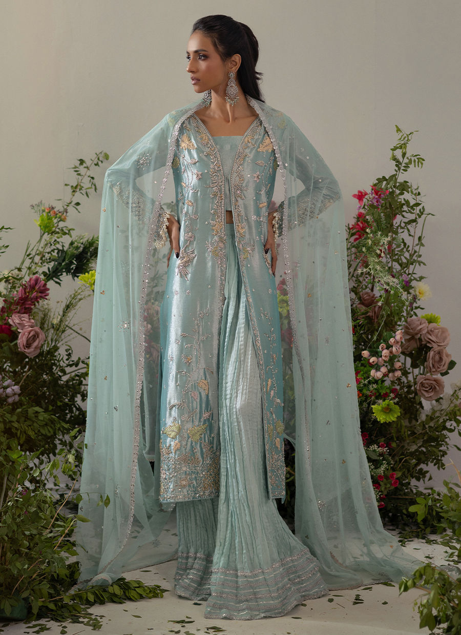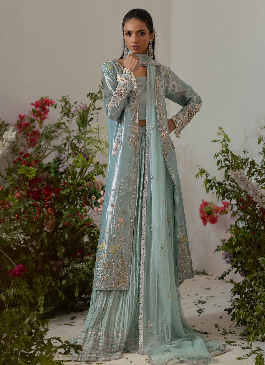Elegant long jacket crafted on a soft ice blue canvas, embellished with detailed silver and muted gold zardozi work. Delicately enhanced with subtle resham, the intricate zardozi details exude sophistication. The sleeves feature intricate cutwork and dangling tassels, adding a touch of charm. This jacket pairs beautifully with a bustier and crushed sharara, complete with silver gota edging on the hemline, and a net dupatta adorned with sequins spray.