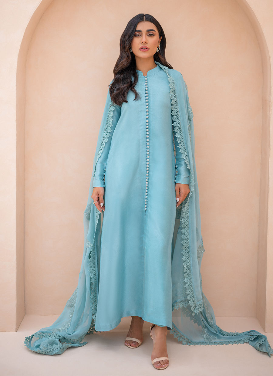Draped in the ethereal allure of icey blue, this raw silk sherwani ensemble redefines elegance. With intricate embroidered button detailing adorning the front open shirt, and accompanied by sleek straight pants. The chiffon dupatta, embellished with ribbon appliqué and delicate lace finishings, adds a touch of celestial grace.