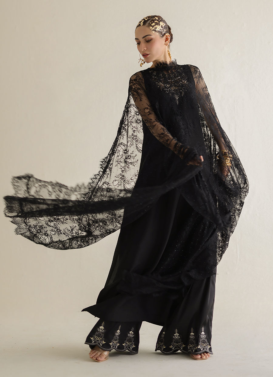 Introducing our moonless night pure raw silk straight shirt, a timeless piece that exudes elegance. Crafted from premium raw silk 80 gms, this shirt features exquisite embroidery with resham, zari, cutdana, tiki stones, and sequins adorning the front, back, and sleeves, adding a touch of sophistication to your ensemble. Paired with candy crape culottes embellished with resham and zari embroidery on the bottom, and complemented by a Chantilly dupatta, this ensemble is perfect for making a statement at any occasion. Elevate your style with this captivating outfit. The model's shirt length is 53.