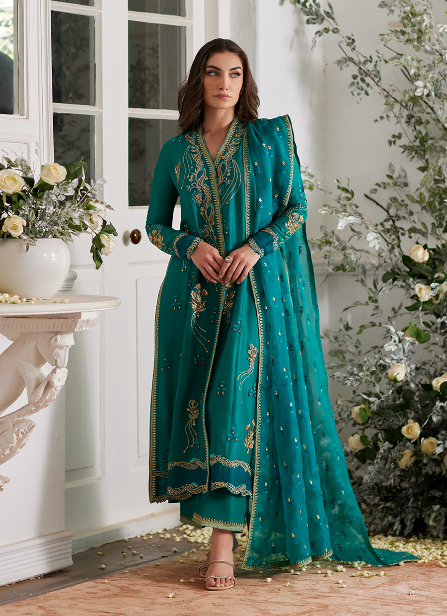 This stunning ensemble makes dressing up for intimate weddings so very easy! An ethereal shade of teal is completely hand embellished with zardozi, sequins, Swarovski crystals and delicately appliqued embroidery in dark teal.Impeccably constructed and delicately embroidered, this relaxed fit, straight column shirt is an absolute fail-safe piece.The sleeves feature a lovely embroidered motif and intricate borders that coordinate with the pure silk pants.A teal organza dupatta with embroidered gold borders completes the ensemble.Wear it to your next festivity with a strappy flat for a day time celebration, or sky high heels and statement earrings for a night time festivity.