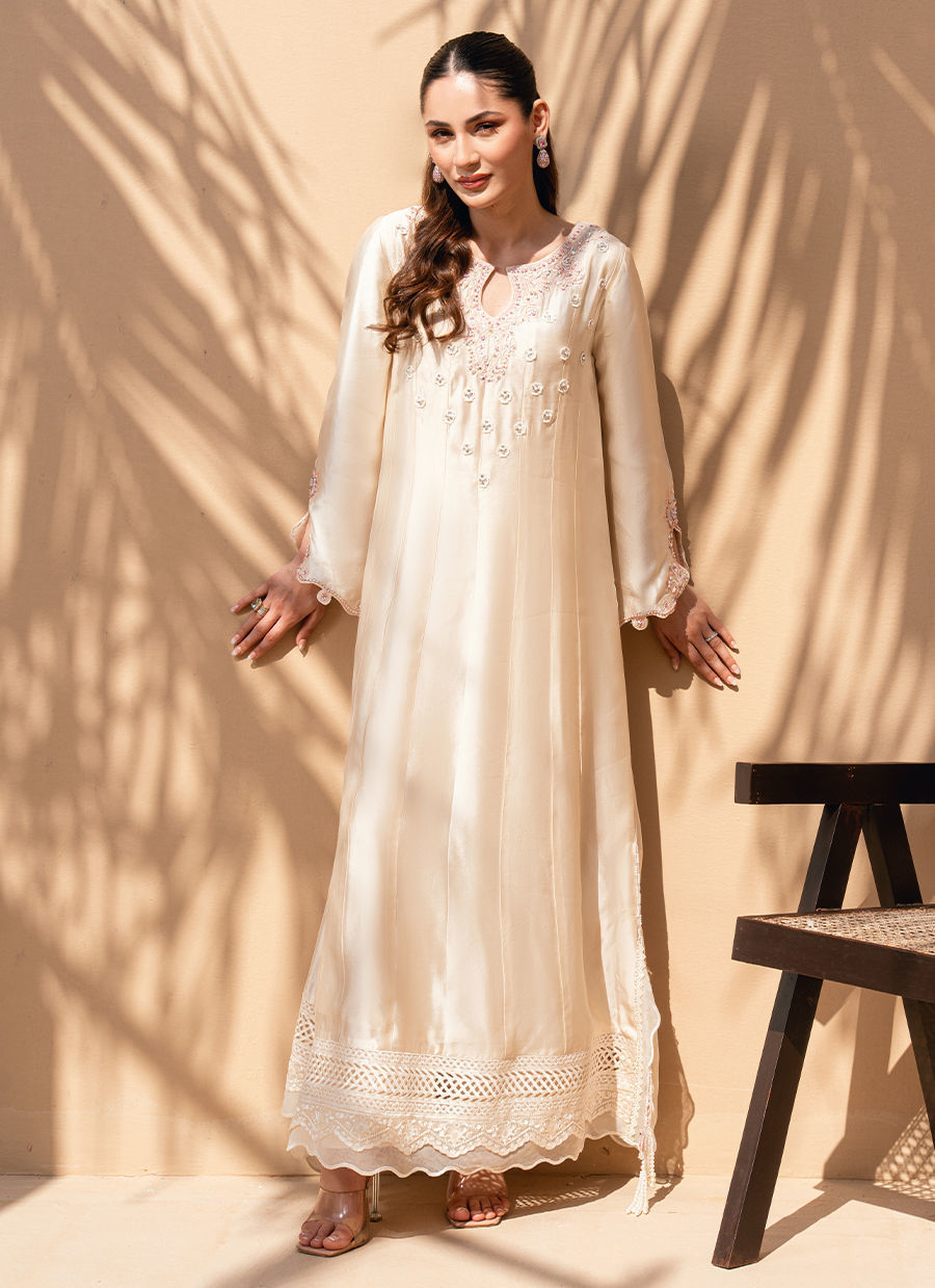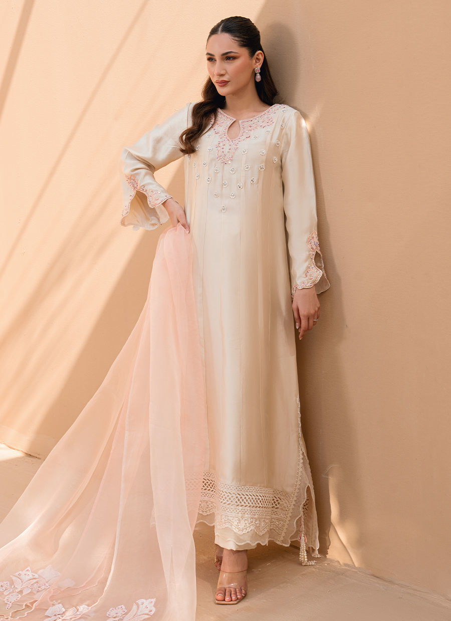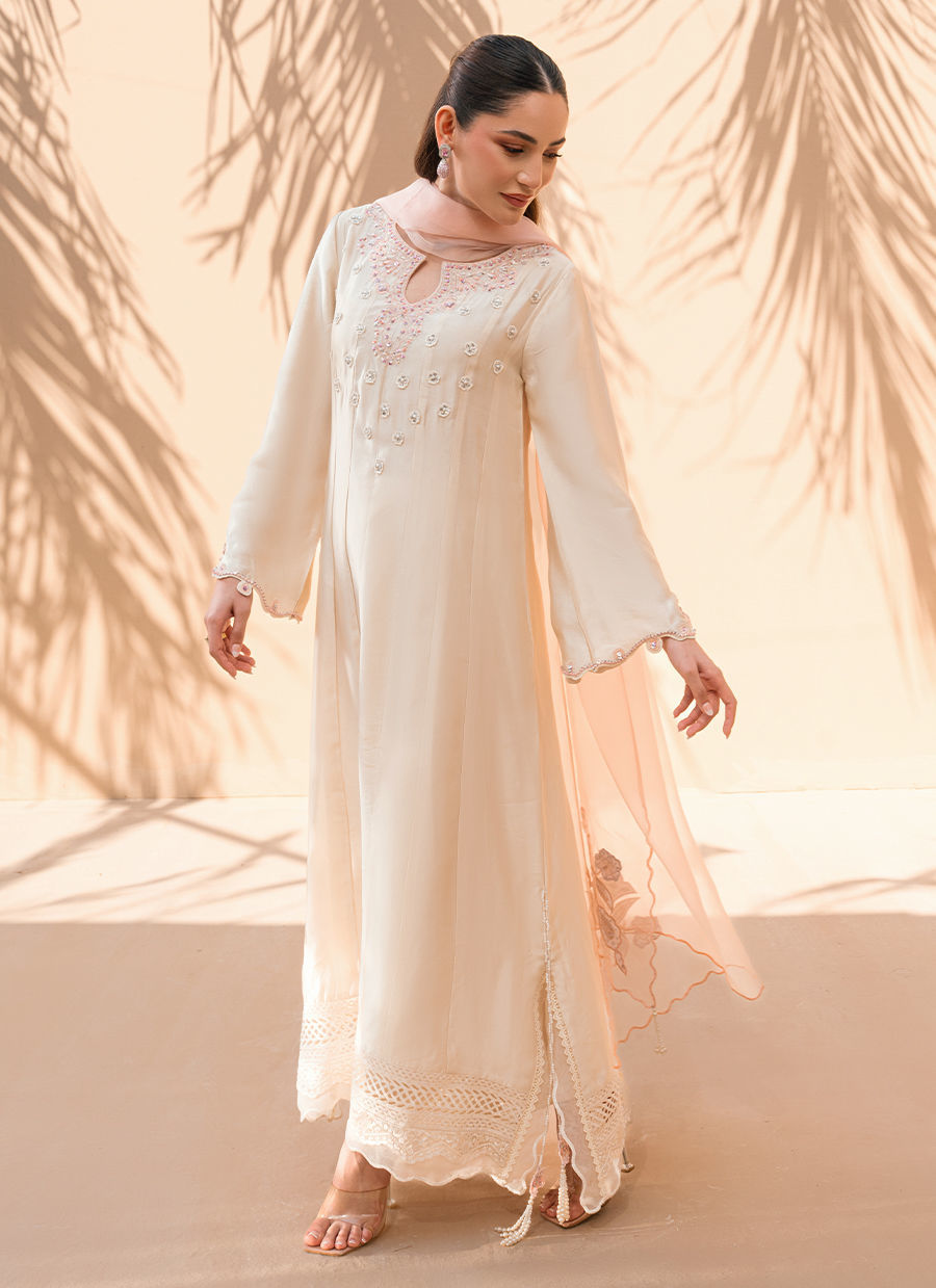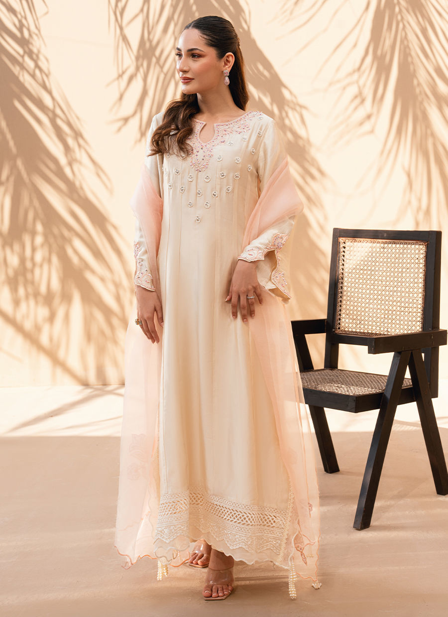 An ode to effortless grace, this ivory long silhouette exudes quiet femininity and refined charm. Crafted in a fluid, lightweight fabric, the outfit features delicate blush-toned thread embroidery scattered across the bodice, complemented by an intricately detailed neckline for a subtle yet elegant focal point. The sleeves are finished with fine embroidered accents, while the hemline is adorned with lace detailing that adds depth and texture to the flowing silhouette. Paired with a sheer blush dupatta, this ensemble is perfect for daytime festivities, garden gatherings, or intimate celebrations—where elegance speaks softly yet leaves a lasting impression.