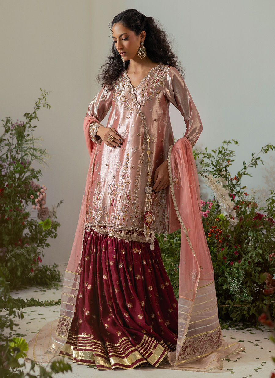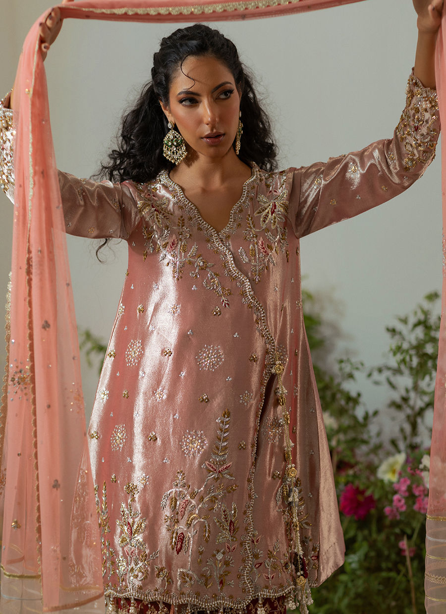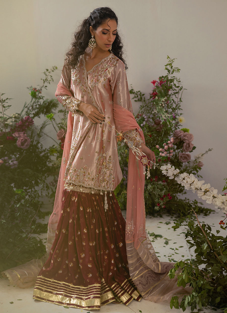 An Angharka in a delicate rose gold hue, falling to knee length, adorned with traditional zardozi embellishments in silver, gold, and antique finishes. The front center is embellished with handcrafted hanging tassels, and can be paired with a classic gharara featuring gota detailing on lorex fabric. Complete the look with a color-blocked dupatta showcasing sequin embellishments and organza zari panels on each end.