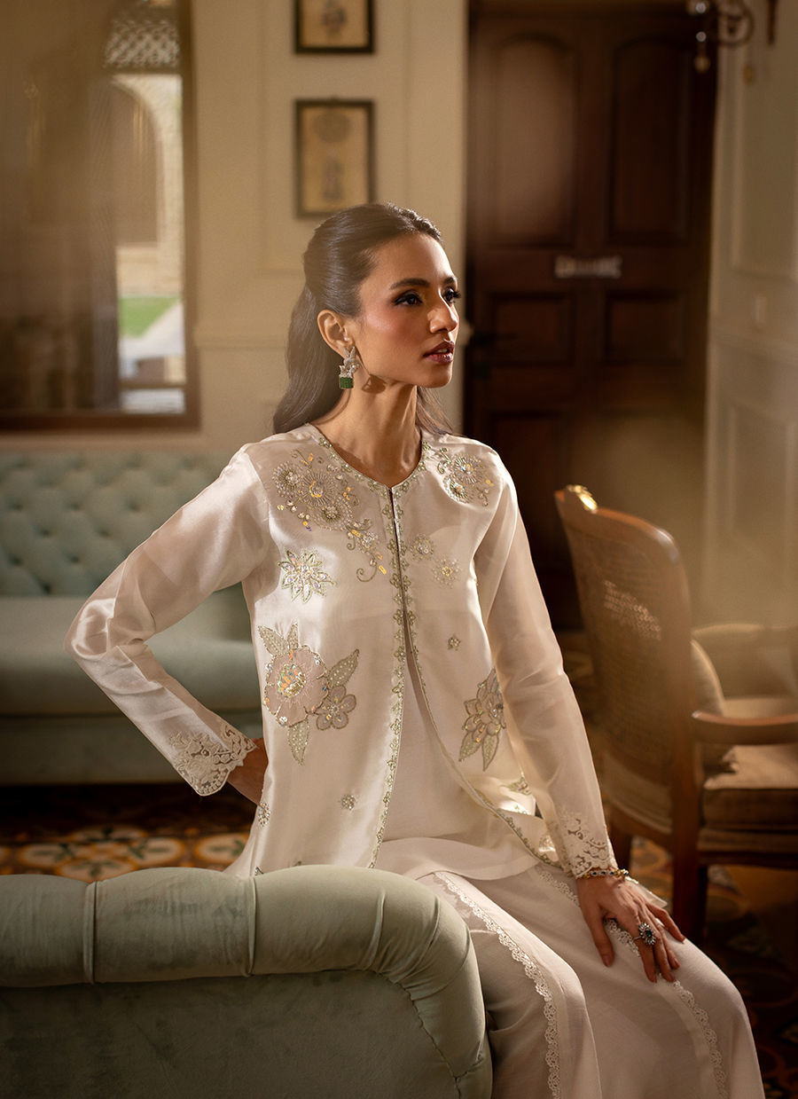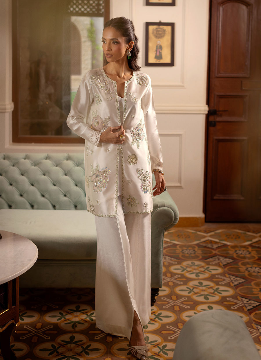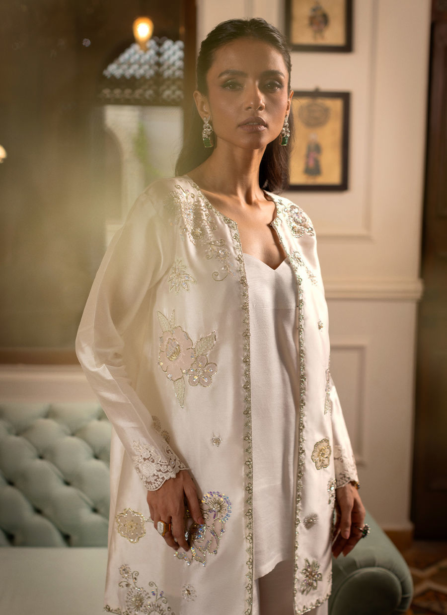 Azeza - Knee length jacket in subtle white silk canvas featuring subtle sheer floral appliqué details in lilacs, pinks and lemons, the appliqué rosettes are adorned with all silver hand embroidered details featuring pearls and light catching crystal. The jacket comes with slip and a matching flared pants to set you apart this festive season