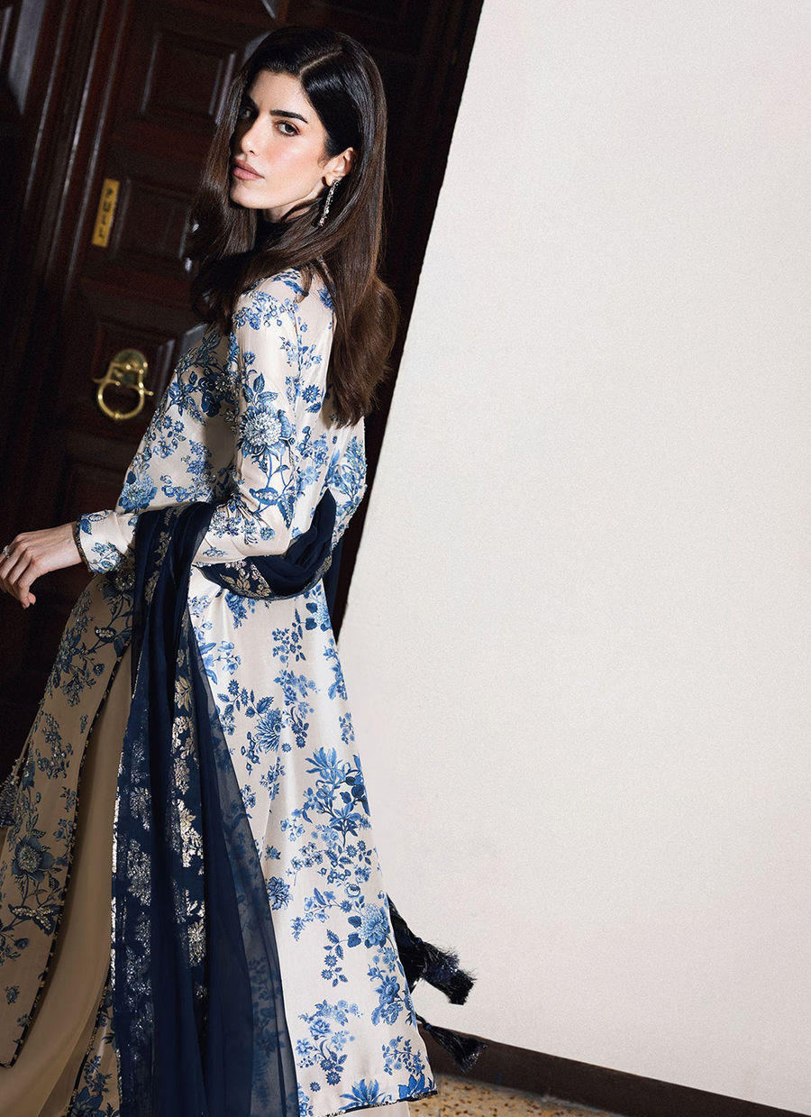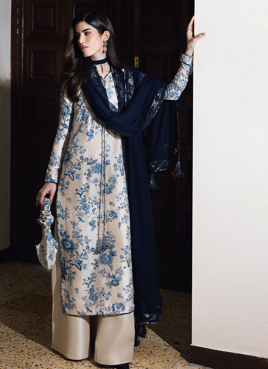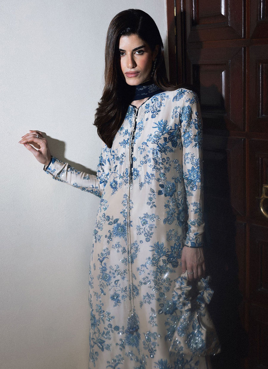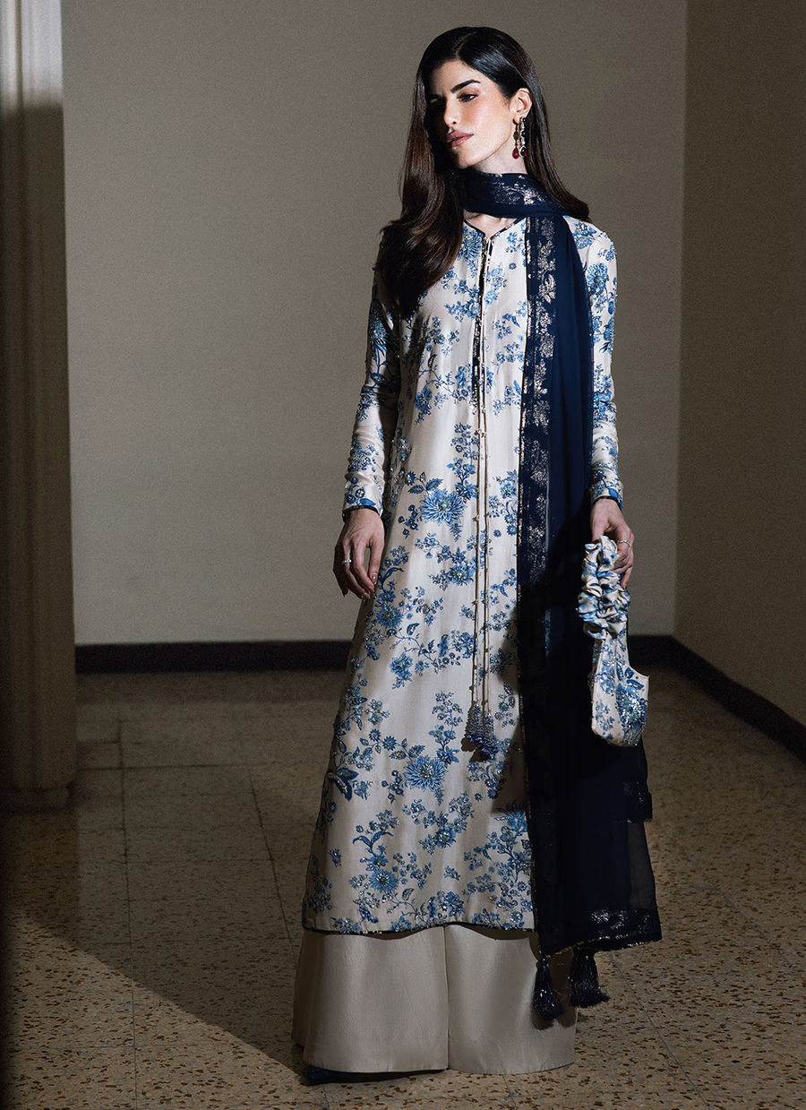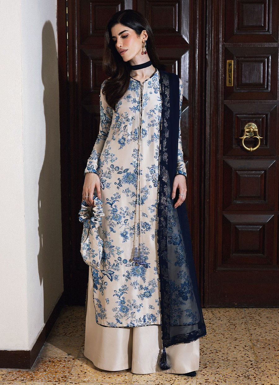 This elegant ensemble features a classic ivory and navy blue color palette, combining intricate floral patterns with modern tailoring. The long, straight-cut kameez is crafted from a lustrous ivory silk-blend fabric, entirely covered in an intricate blue floral print reminiscent of traditional porcelain. The neckline is designed with a small split-round opening, accented by long, thin drawstrings that terminate in decorative navy tassels. For the bottoms, the shirt is paired with voluminous, wide-leg palazzo trousers in a solid ivory silk that provides a clean, fluid contrast to the busy print of the top. A deep navy sheer dupatta, likely made of chiffon or organza, is draped over the shoulder and features matching blue and silver facing along its borders.