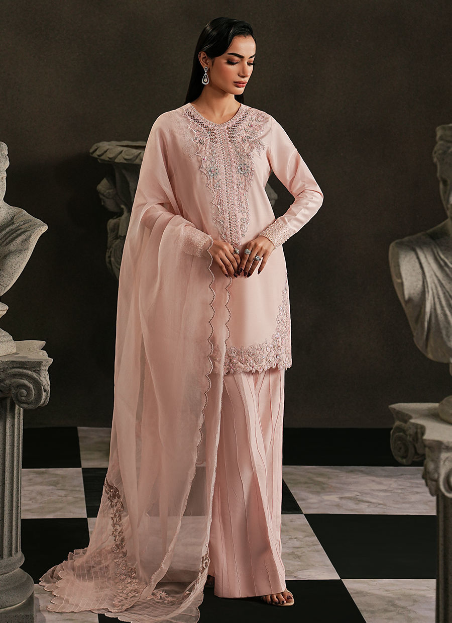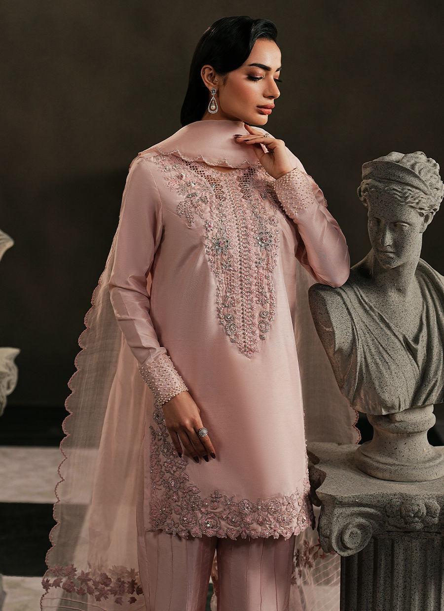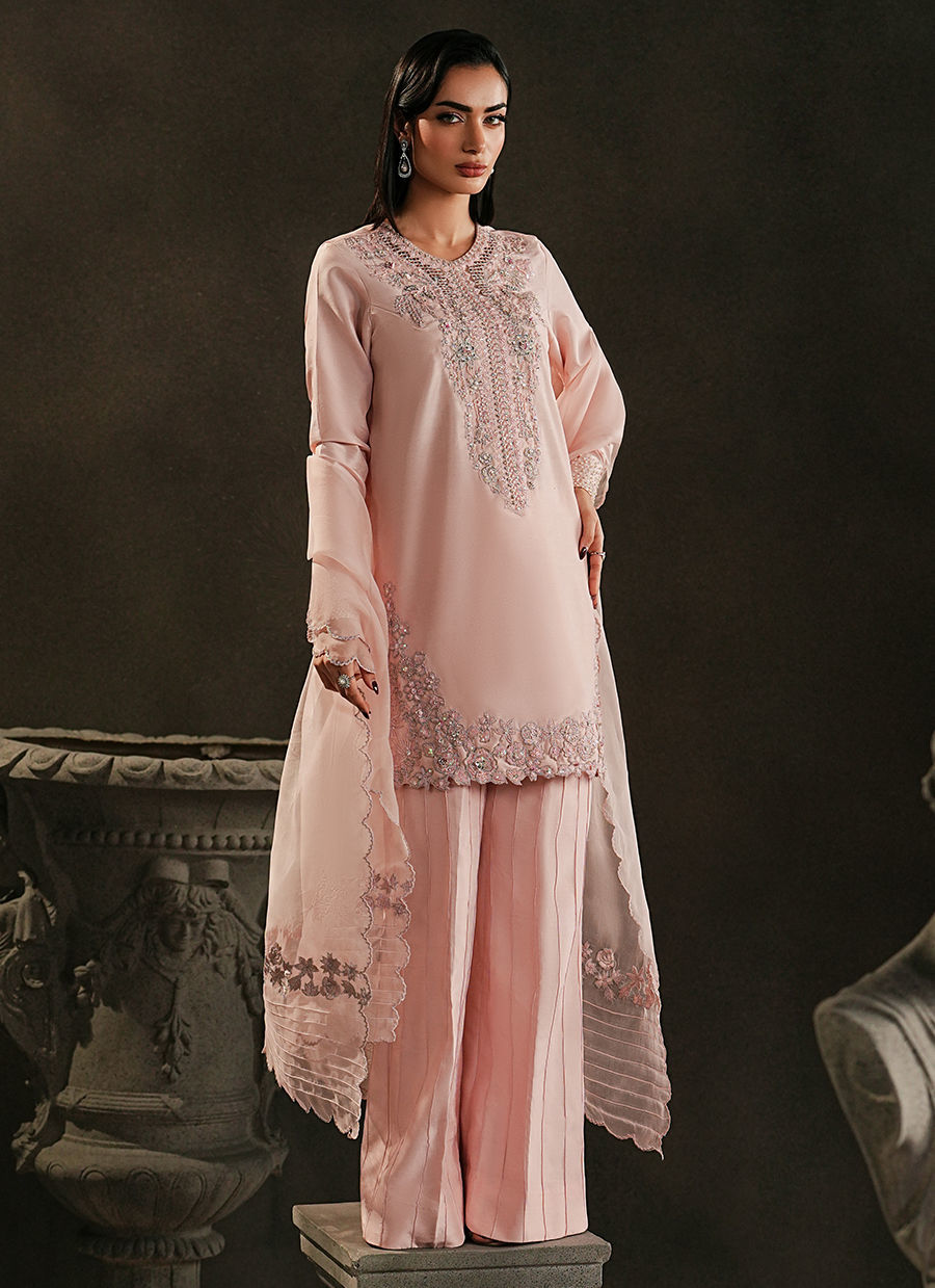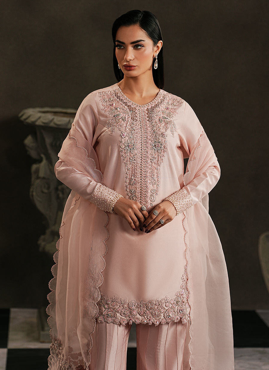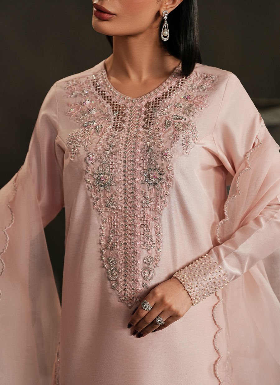 Ballet carries a soft desi essence in powder pink Pure Silk/Tussel Silk, its natural sheen giving the look a quiet elegance. Hand embroidery, hand embellishment, and delicate cutwork trace the neckline, adding depth and craft chosen especially for Eid celebrations. The flared trousers are tailored in a lightweight silk blend for ease and movement, keeping the look graceful and comfortable through a full day of gatherings. An airy organza dupatta, finished with embroidered borders, completes the ensemble in the most classic Eid way, honoring tradition while still feeling light, fresh, and effortlessly festive.