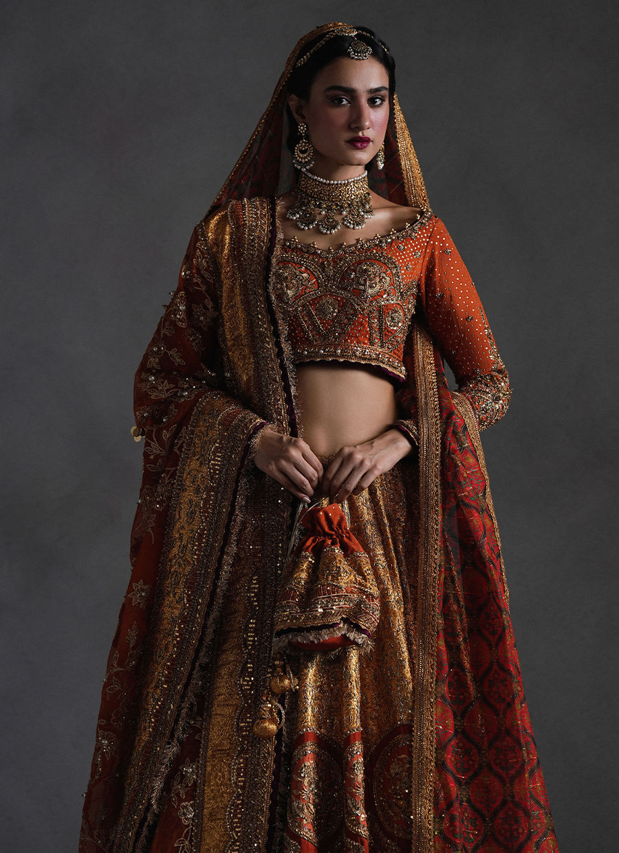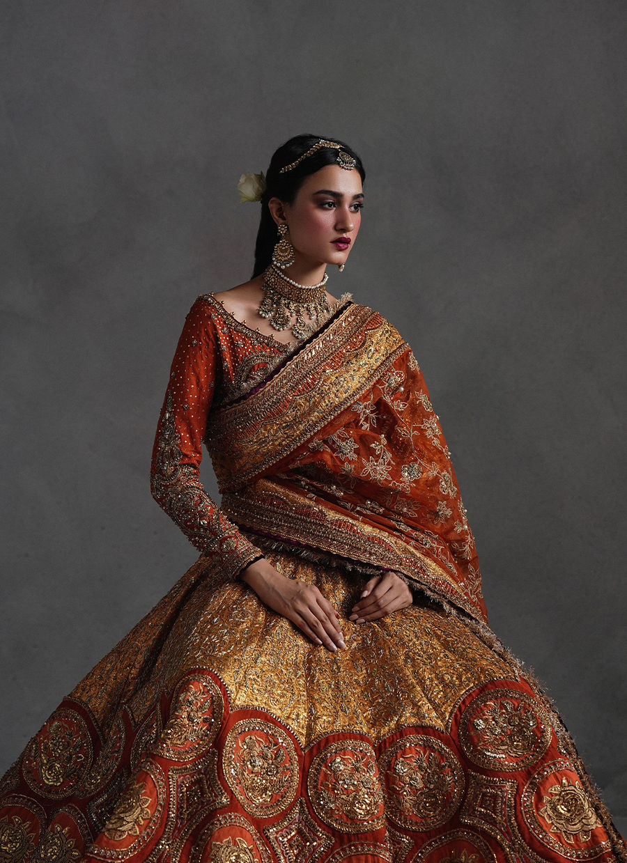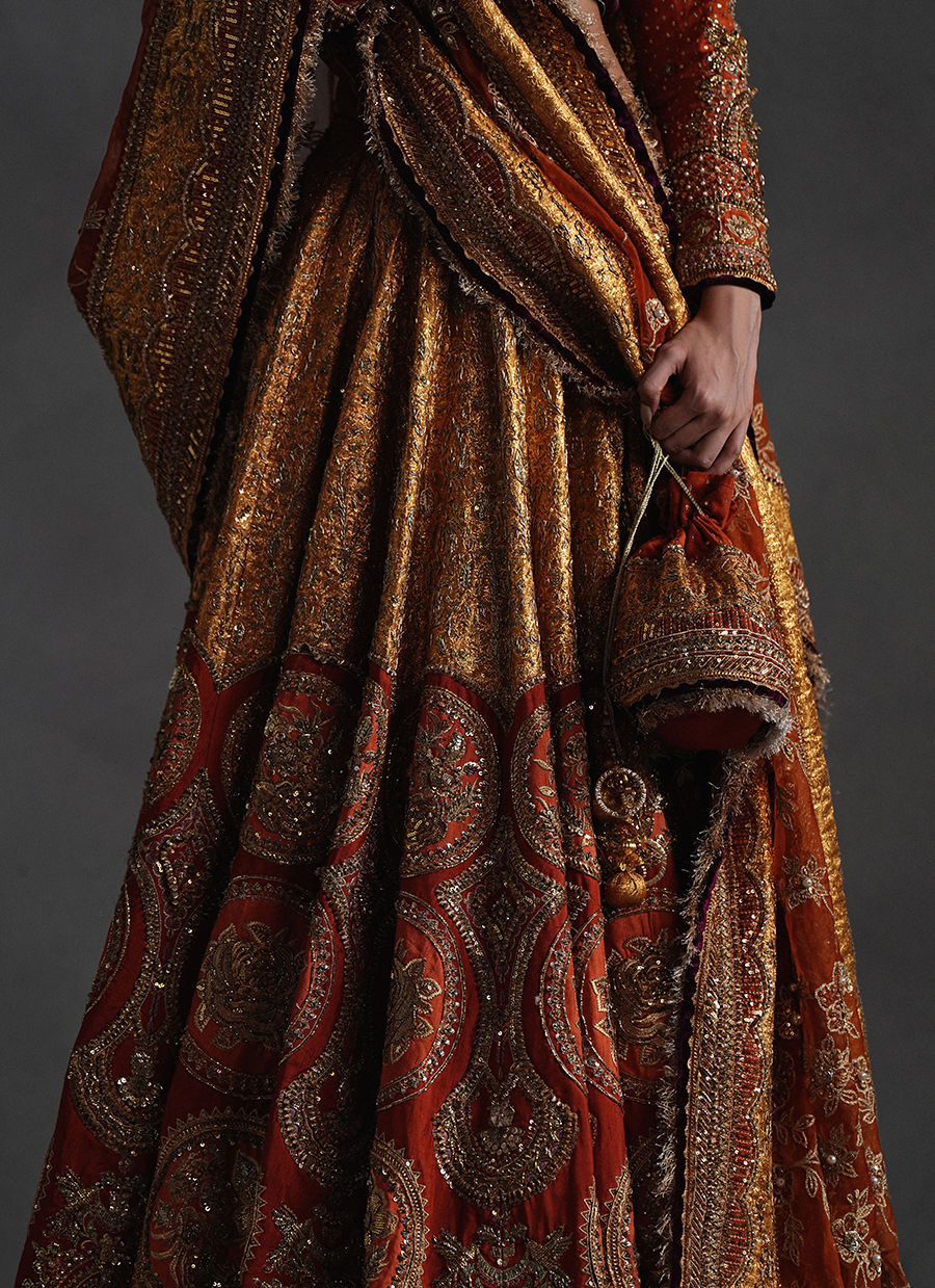 Bano begum Is a marigold orange ensemble it is a dazzling ode to celebratory grandeur. The Italian silk choli glows with golden trims, heavy adda work, and a dusting of sequins, while the jamawar lehenga is mapped with roundels enclosing floral emblems, painstakingly embroidered across its breadth. Two dupattas offer layered drama, one richly worked organza with four-sided jamawar borders and gold embellishments, the other feather-light and printed, offering a breezy counterpoint. A bejeweled pouch, dripping with sequins, trims, and beadwork, completes this look