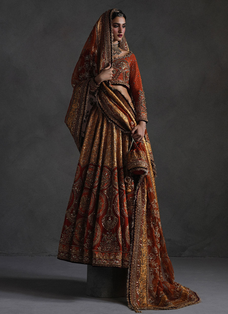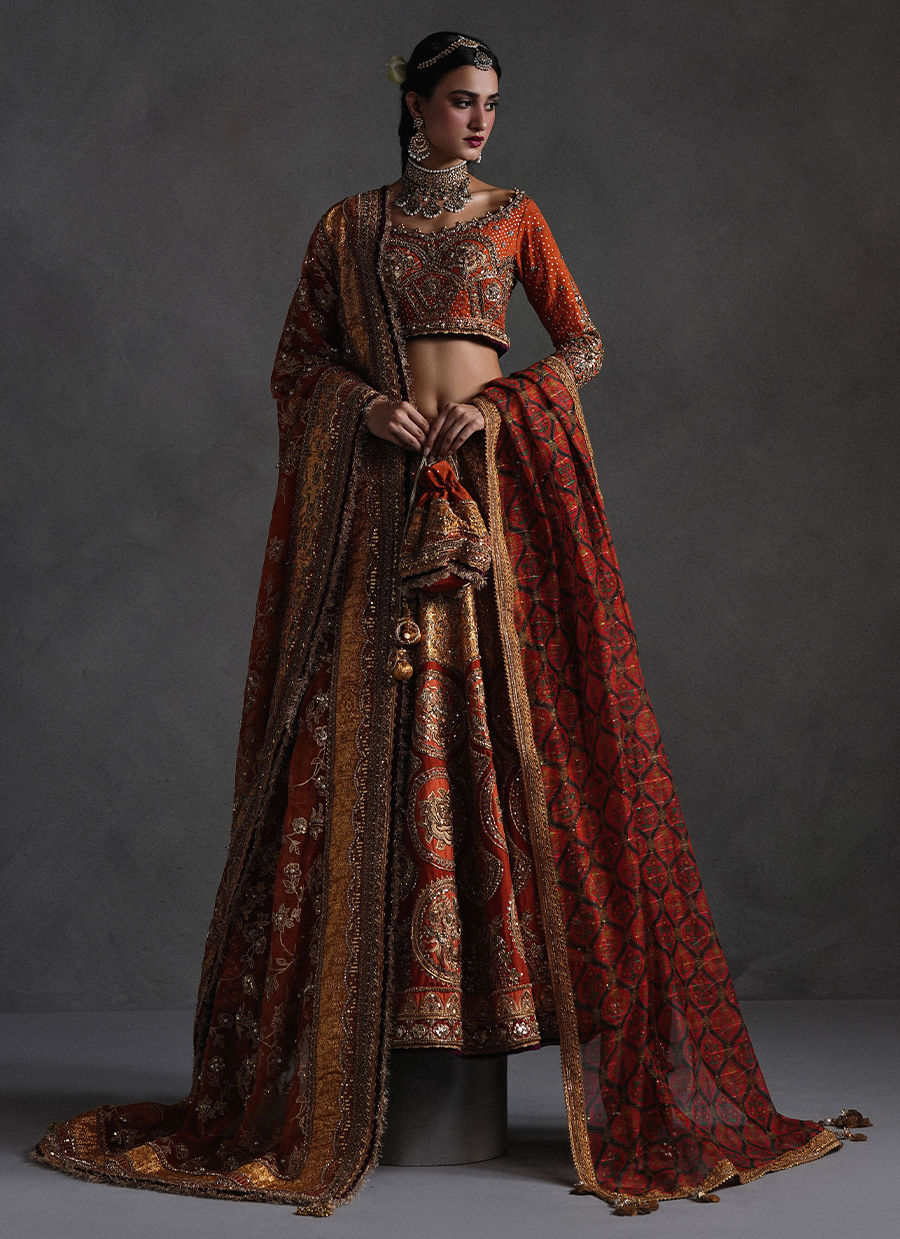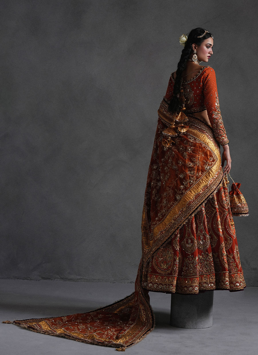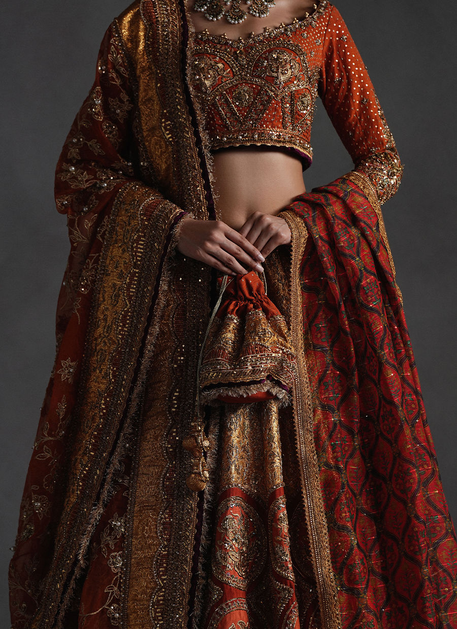 Bano begum Is a marigold orange ensemble it is a dazzling ode to celebratory grandeur. The Italian silk choli glows with golden trims, heavy adda work, and a dusting of sequins, while the jamawar lehenga is mapped with roundels enclosing floral emblems, painstakingly embroidered across its breadth. Two dupattas offer layered drama, one richly worked organza with four-sided jamawar borders and gold embellishments, the other feather-light and printed, offering a breezy counterpoint. A bejeweled pouch, dripping with sequins, trims, and beadwork, completes this look