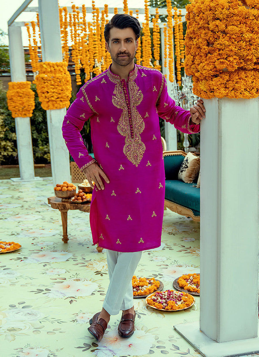 Pure raw silk kurta in deep fuchsia shade featuring dull gold and bronze zardozi details. The neckline of the kurta is adorned with light catching sequins and enhanced with loops and handcrafted buttons. The kurta is paired with straight cotton pants.