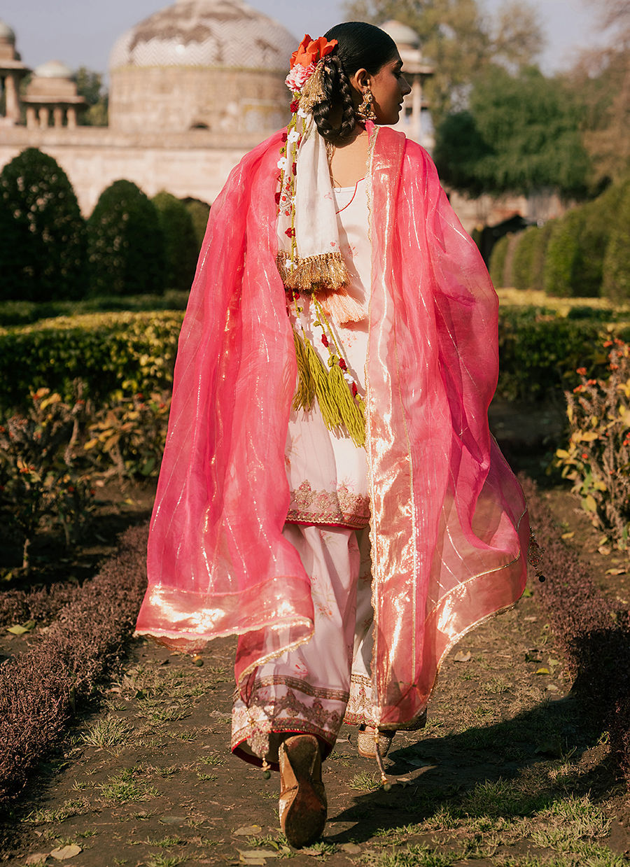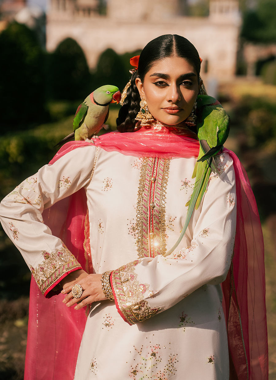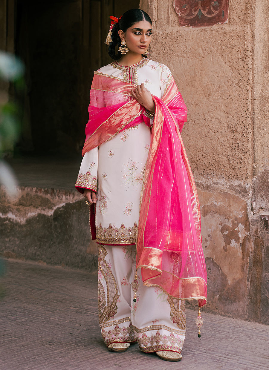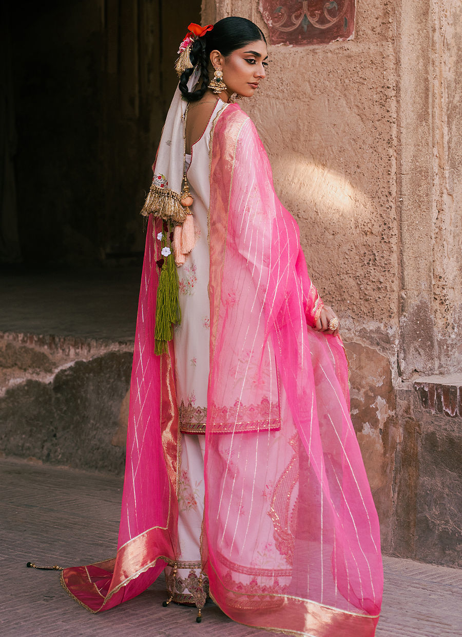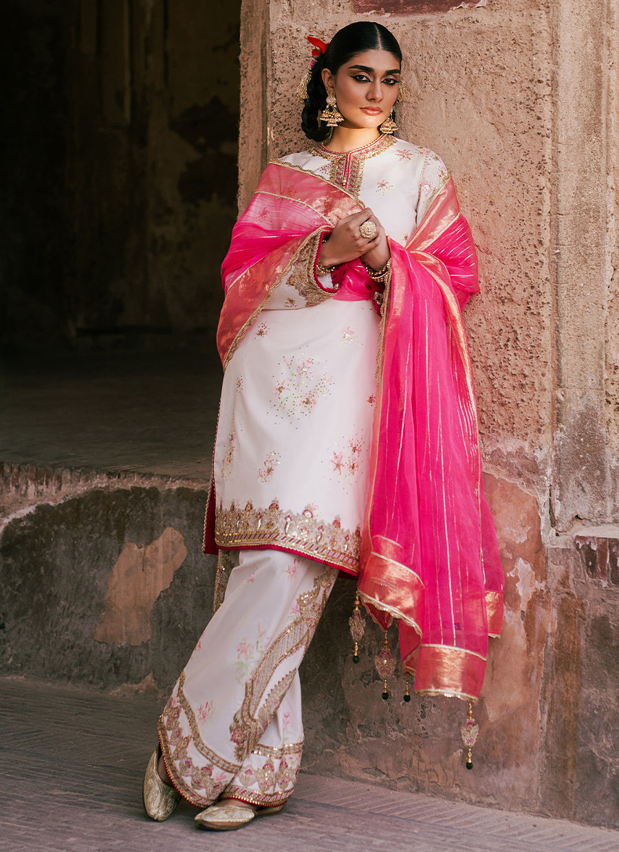 Bayaan – A pristine white cambric shirt, gracefully adorned with a delicate border and intricate adda work that reflects timeless craftsmanship. It is paired with a cambric shalwar, enhanced with embroidered borders and subtle motifs for added elegance. The ensemble is completed with a Kacha Tila organza dupatta, lending a soft shimmer and refined festive charm to this classic look.