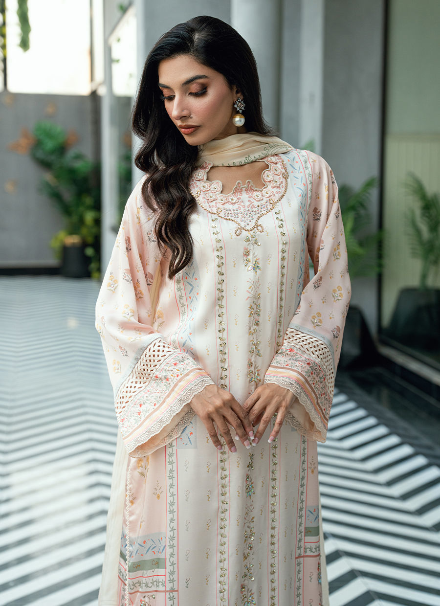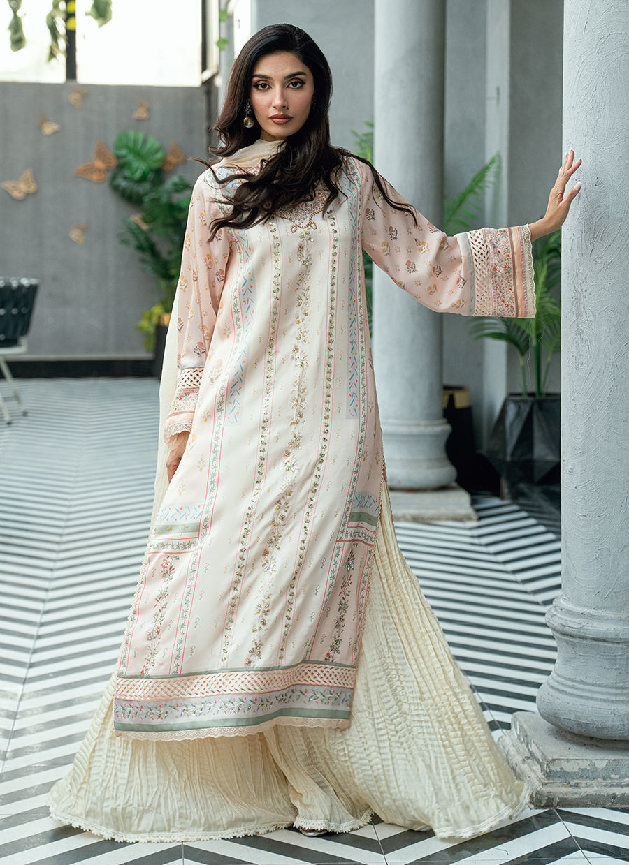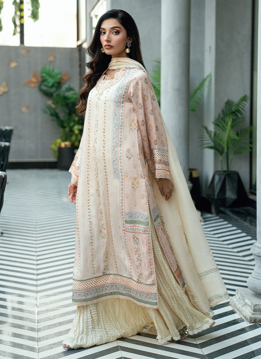 Paired with a matching digitally printed dupatta that complements the pastel palette and flowing crushed gharara pants in a coordinated ivory tone, this ensemble offers elegant movement and timeless appeal. Ideal for festive occasions, Eid celebrations, and sophisticated daytime events.