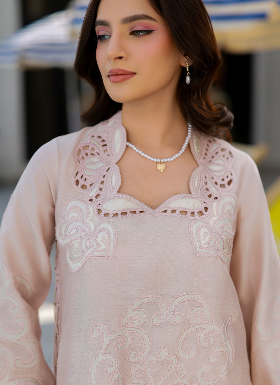 Color: Pale Pink Fabric: Khaddi Silk Work Details: Applique, Cutwork, Embroidered