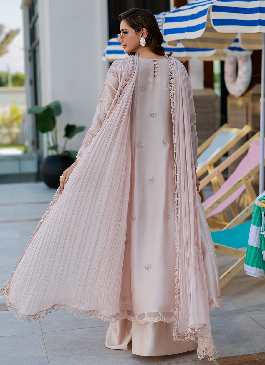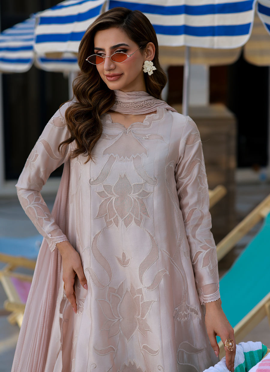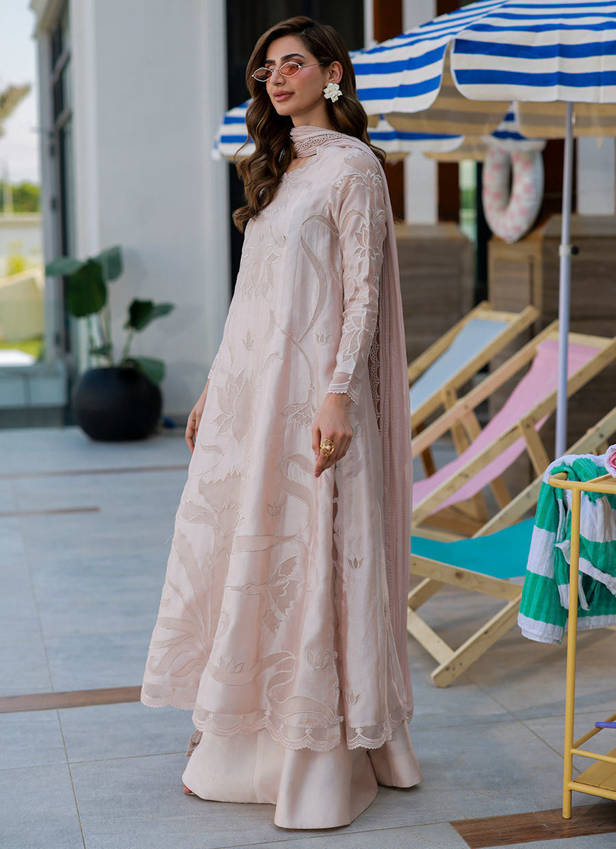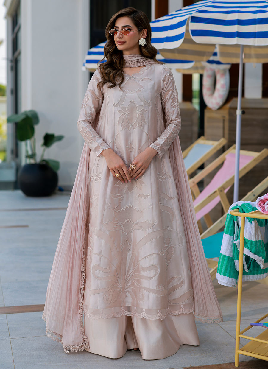 A nude self-on-self long kalidar shirt in Sheesha silk,accented with delicate organza appliqués and subtle embroidery techniques that add depth and texture. Paired with wide-leg Medium silk izar pants and finished with a laced, crushed dupatta, this ensemble embodies understated elegance with a refined, editorial sensibility.