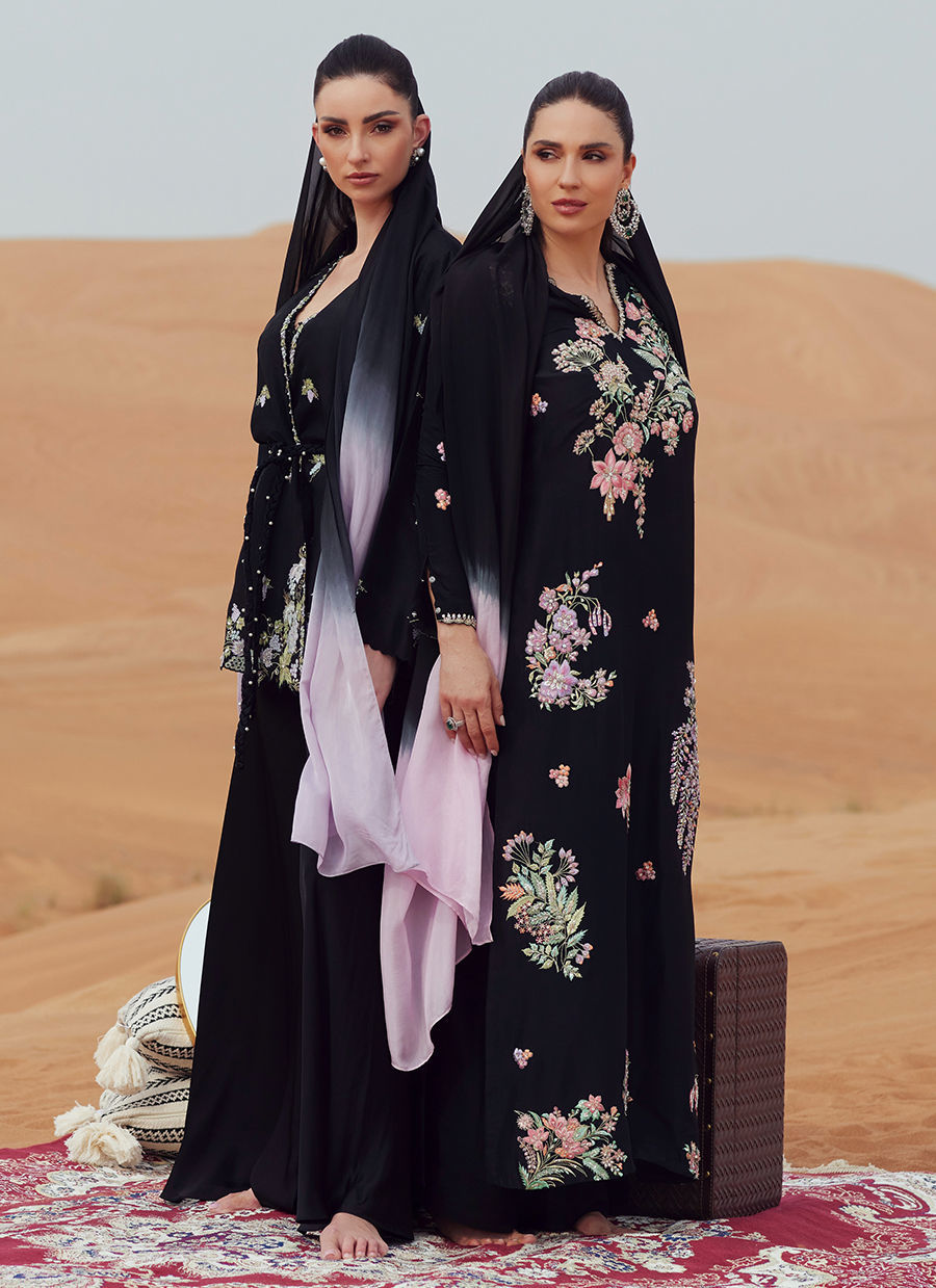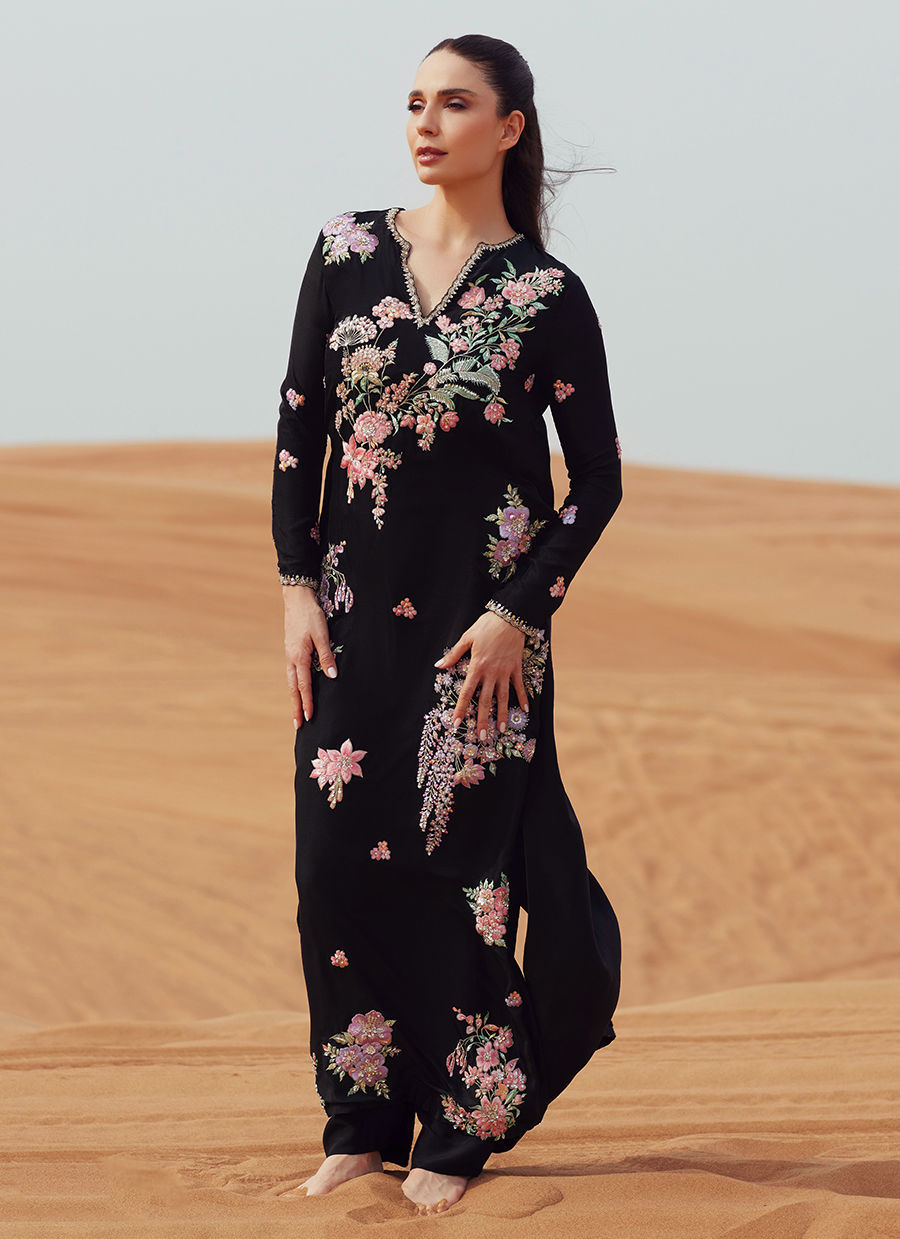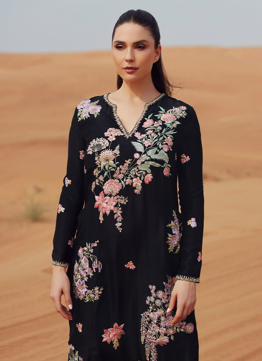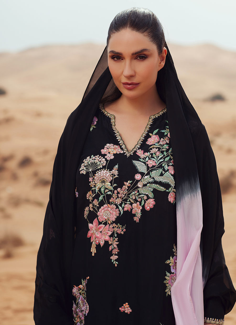 A full-length straight shirt crafted in pure raw silk, richly embroidered and intricately embellished throughout for a statement finish. Paired with a sleek straight-cut trouser in Korean raw silk, creating a refined and elongated silhouette. Completed with a black ombre dupatta accented with soft pink accents for a striking contrast.