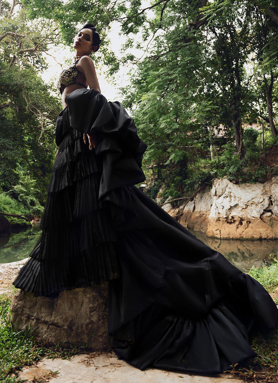 Exuding an aura of unparalleled luxury, the Black Muse ensemble redefines sophistication with a touch of whimsical charm. The blouse, adorned with luminous multicolor hand embellishments and a flattering neckline, sets the tone for opulence. The true allure lies in its intricate embroidery, where linear patterns gracefully intertwine with blossoming florals, creating a mesmerizing textural symphony for the most discerning tastes. Complementing this is a ruffled black skirt, exquisitely detailed to enhance its elegance. This masterpiece celebrates exceptional craftsmanship, making it a timeless statement of refined elegance and artistic allure. Model Height 5'5 Blouse Length: 14 Front Depth:8.5 Skirt Length:61 Tefta Length: 60