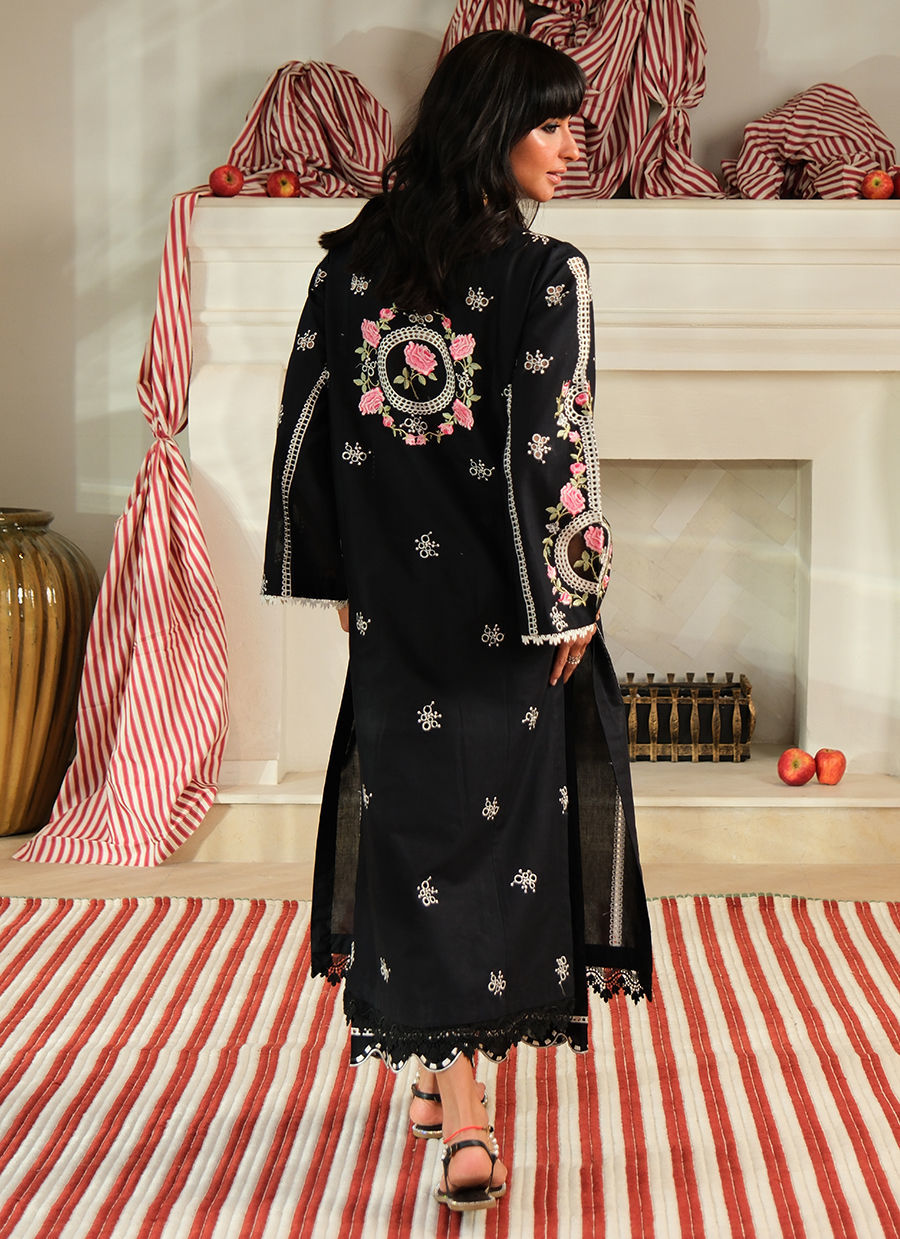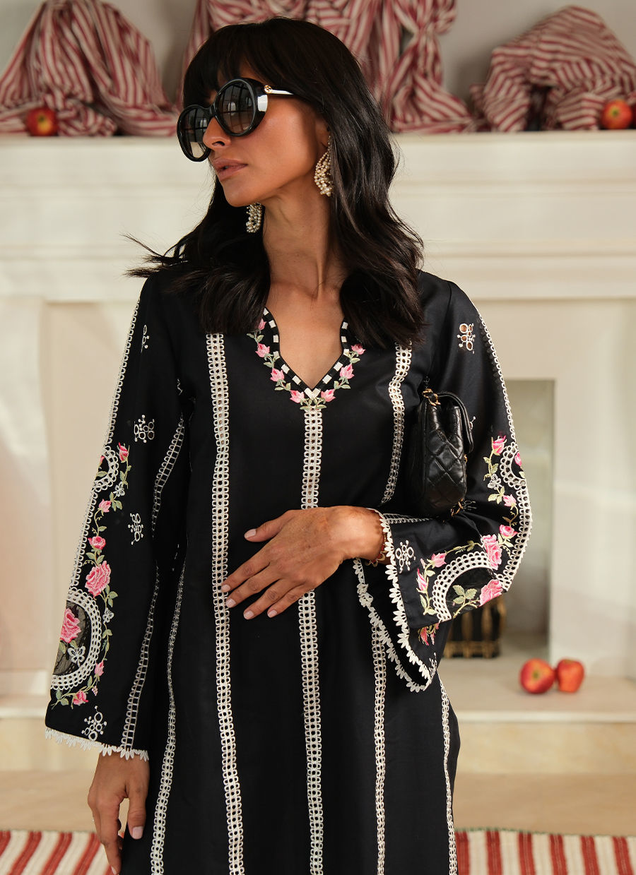 “Crafted from premium pure cotton, this outfit is elevated with delicate floral embroidery in soft pinks and greens, thoughtfully placed across the back, sleeves, and neckline, framed beautifully with finely detailed cutwork. Vertical lace inserts run along the length of the shirt, creating a flattering, elongated silhouette, while matching lace trims finish the cuffs and hem with refined grace. The sleeves feature signature circular cutwork panels with embroidered accents. Paired with coordinating pants, this look is effortlessly chic—perfect for both daywear and understated evening elegance.”