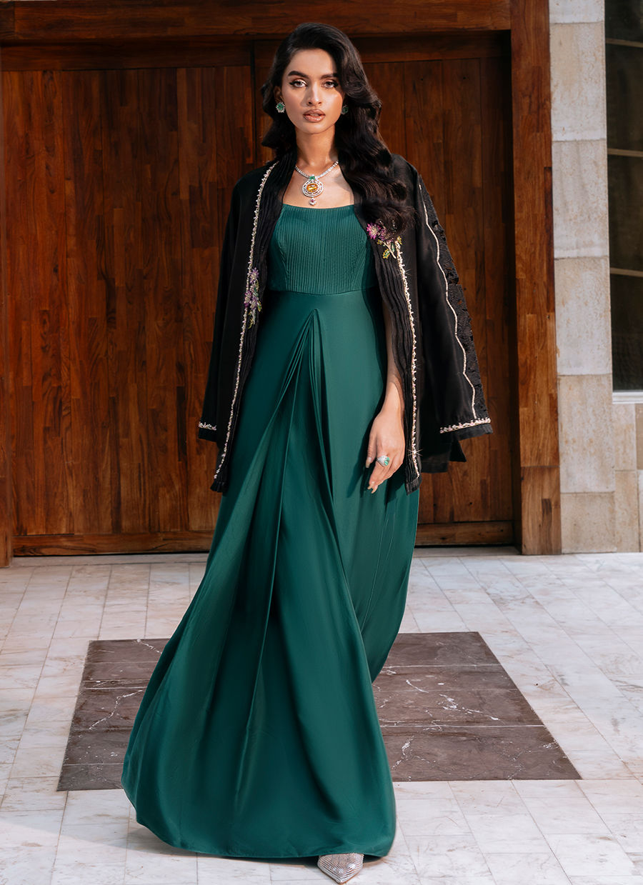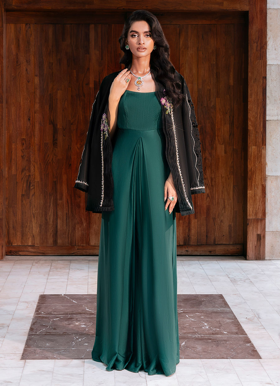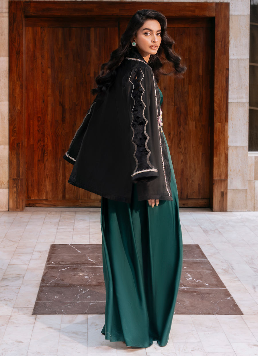 Black Wave is a classic statement piece crafted from pure raw silk. The sleek black jacket features intricately hand-embellished motifs, complemented by elegant cutwork and organza detailing on the sleeves for a modern, refined touch. The jacket is paired with a beautifully embroidered green inner, adding a bold contrast to the look. For added elevation, the ensemble can be styled with an ombré silk scarf—perfect for making a striking yet sophisticated impression. Shirt Type: Loose Fit Jacket Length: 30 Inner Length: 62 Inner Front Depth: 8 Model Height: 5'6