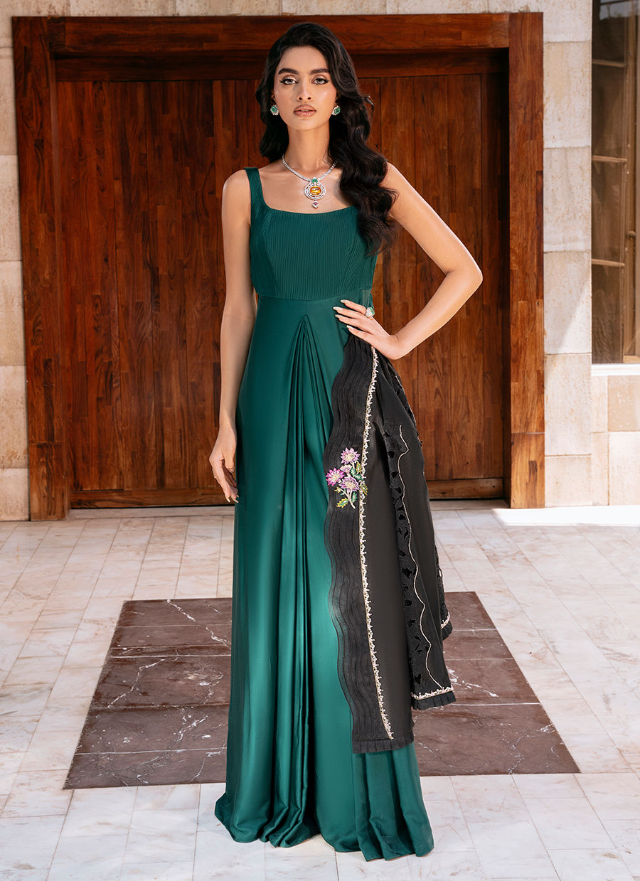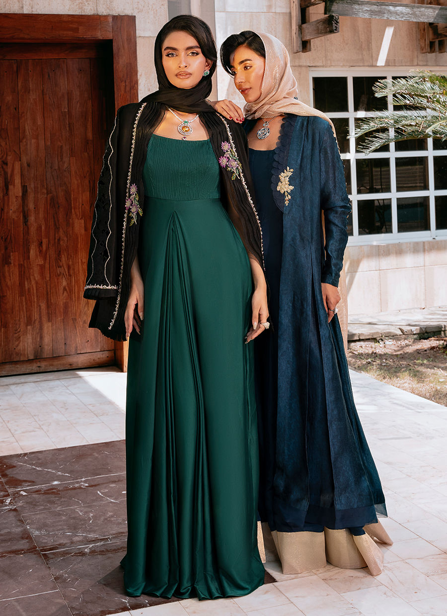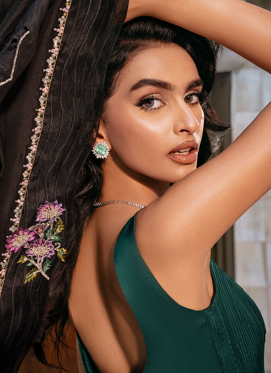 Black Wave is a classic statement piece crafted from pure raw silk. The sleek black jacket features intricately hand-embellished motifs, complemented by elegant cutwork and organza detailing on the sleeves for a modern, refined touch. The jacket is paired with a beautifully embroidered green inner, adding a bold contrast to the look. For added elevation, the ensemble can be styled with an ombré silk scarf—perfect for making a striking yet sophisticated impression. Shirt Type: Loose Fit Jacket Length: 30 Inner Length: 62 Inner Front Depth: 8 Model Height: 5'6