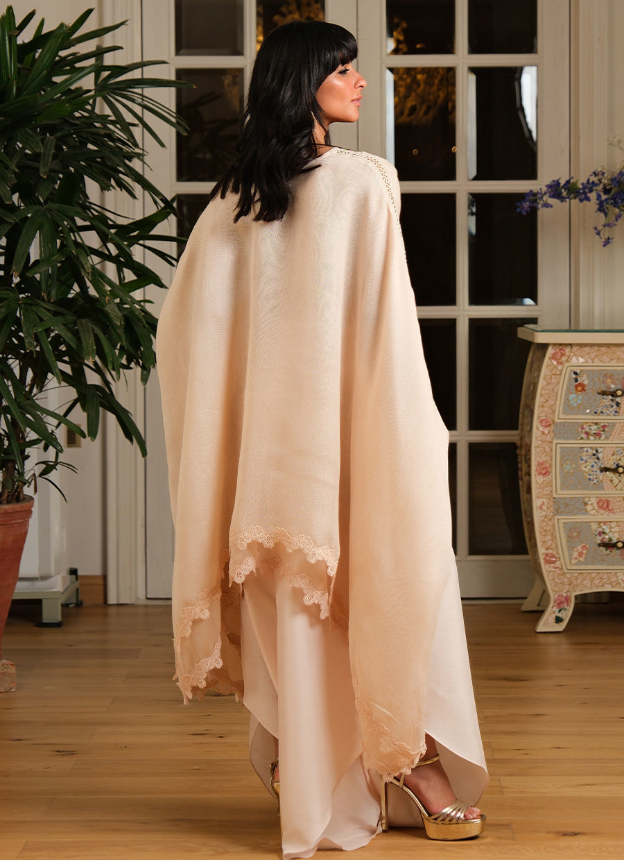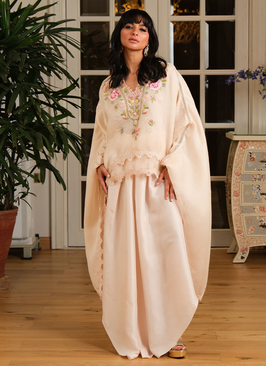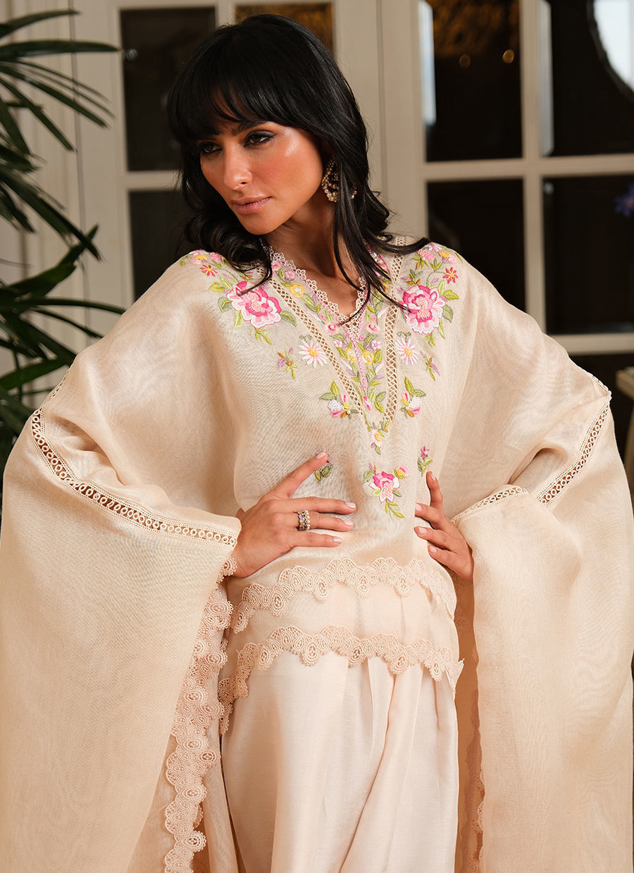 “A quintessential Farida Hasan floral hand-embroidered khadi net cape delicately finished with soft lace detailing, creating a graceful, flowing silhouette. The look is paired with fluid pure satin trousers that add a subtle sheen and effortless movement. Light, elegant, and thoughtfully crafted, this piece balances artisanal embroidery with modern ease, making it ideal for elevated Ramadan evenings and intimate gatherings.”