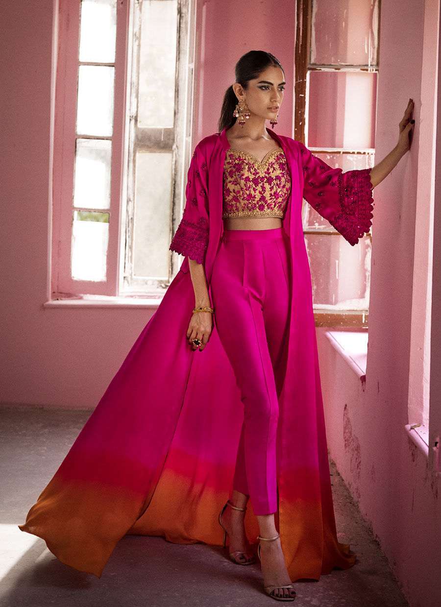 Exude glamour in this ombre shade floor-length jacket with embroidered details on the sleeves. The playful vibrant jacket is paired with exquisitely embellished bustier and matching pants.