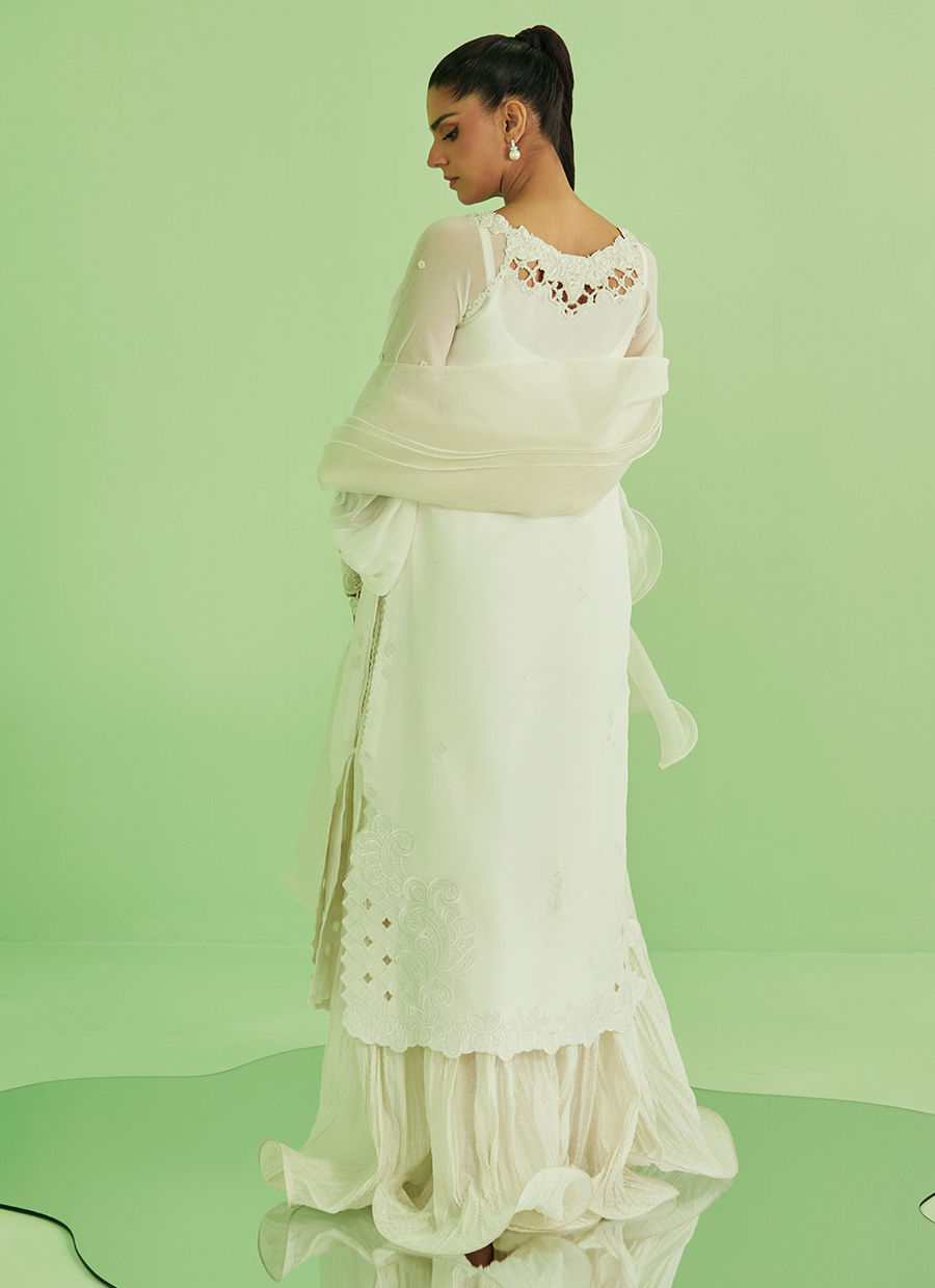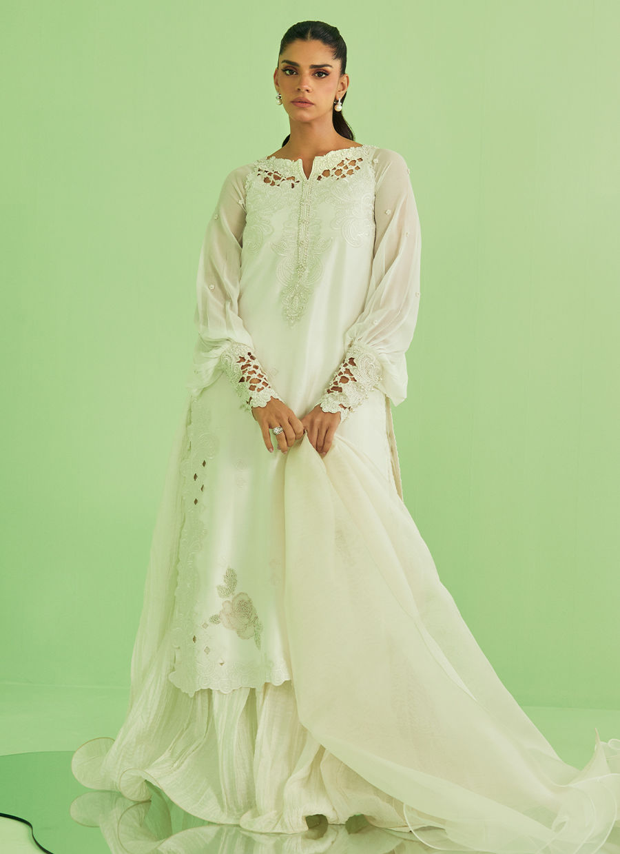 Paired with crushed pants that introduce gentle texture, the look is completed with a draped organza dupatta, flowing effortlessly to enhance its light, airy appeal.