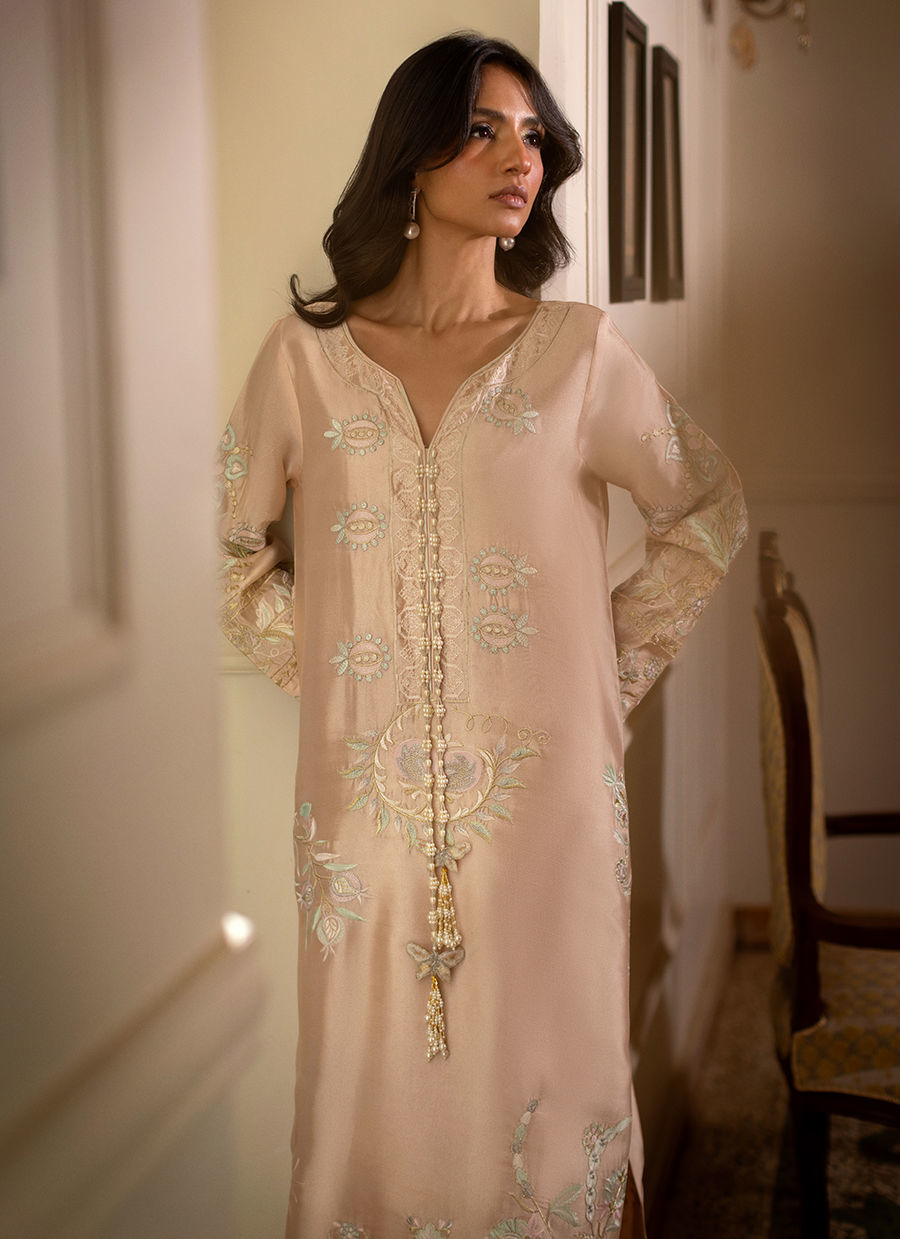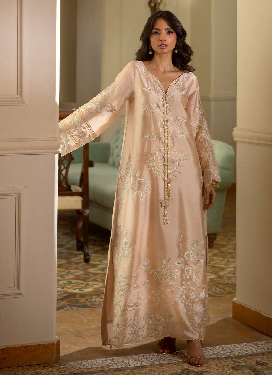Brisa Kaftan - Floor length kaftan in subtle peachy nude shade on glistening silk canvas featuring intricate subtle embroidery details on centre front and back. The neckline is adorned with handcrafted tassels to turn heads this festive season.