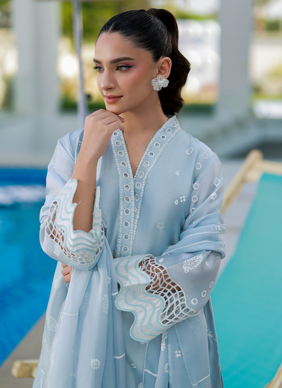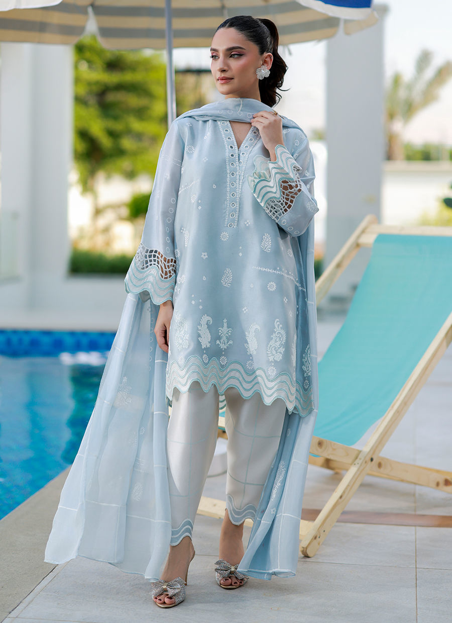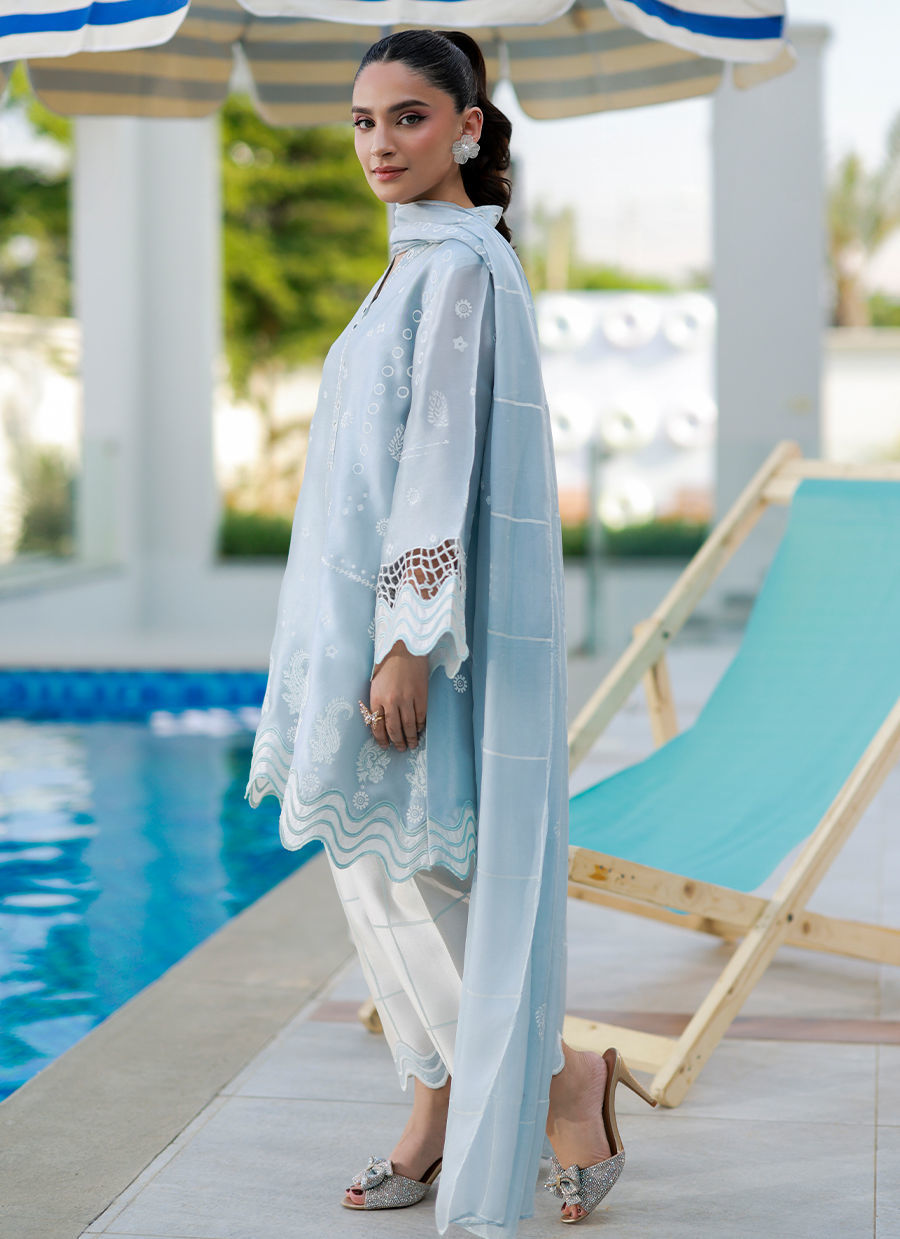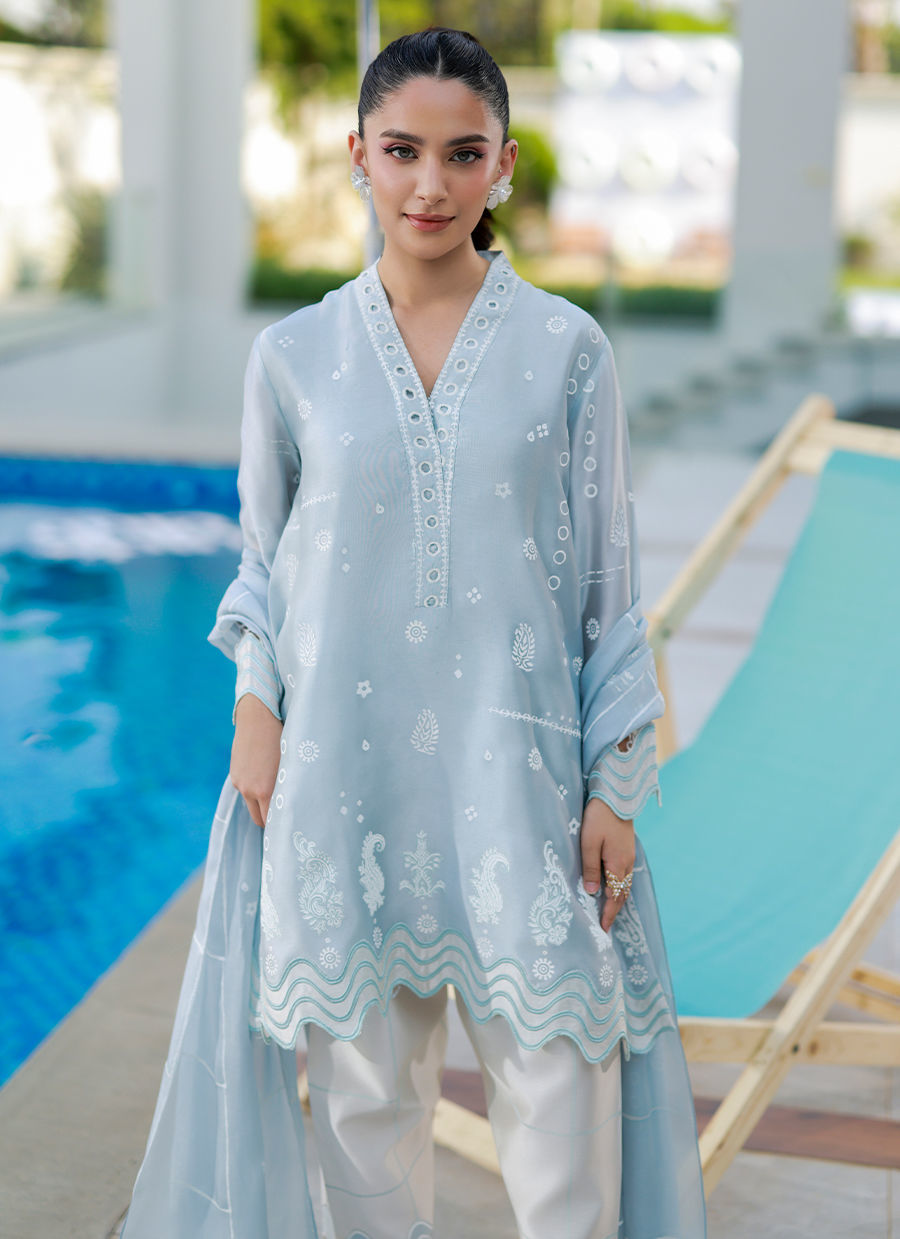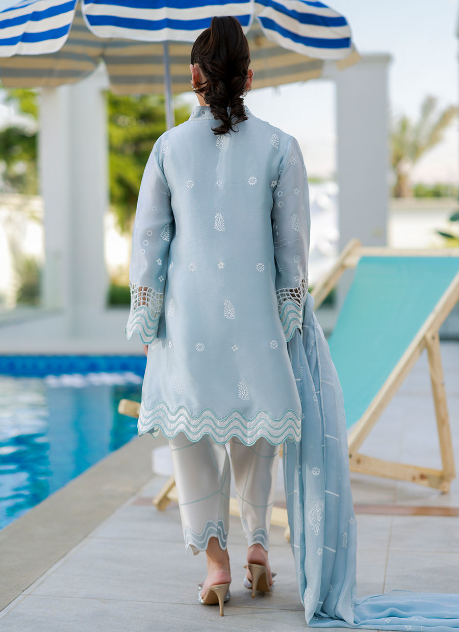 An ice blue sheesha silk short shirt unfolds as a play of pattern and precision, featuring asymmetric block prints across the kurta and sleeves, framed by a sculpted white wavy border along the daaman and cuffs. Intricate checkered cutwork and tilla patti detailing add depth and texture to the sleeves. Paired with a white sheesha silk shalwar, accented with an oversized checkered block print and finished with an ice blue wavy hem, the look is completed with a medium silk dupatta marked by white asymmetric block prints—an editorial expression of modern craft and quiet statement dressing.