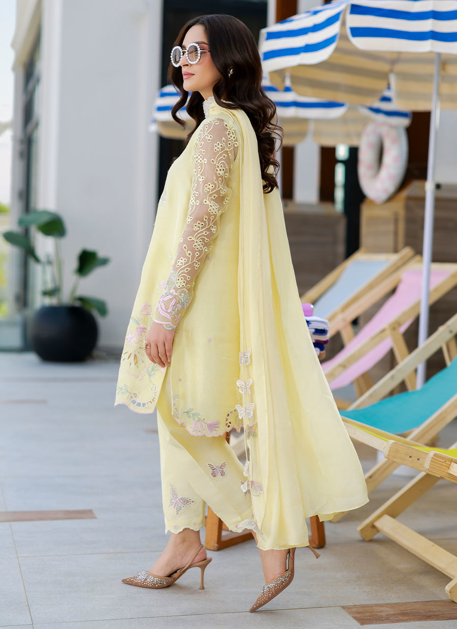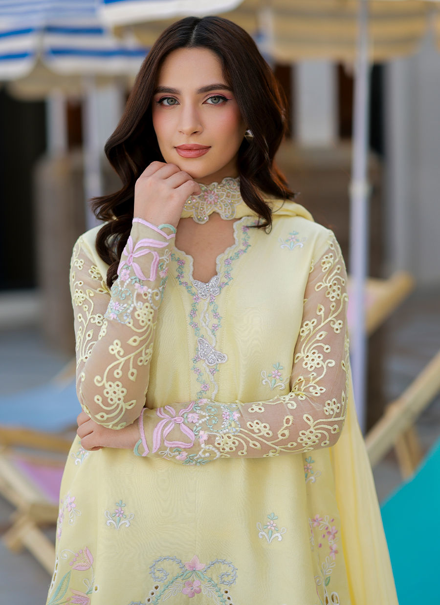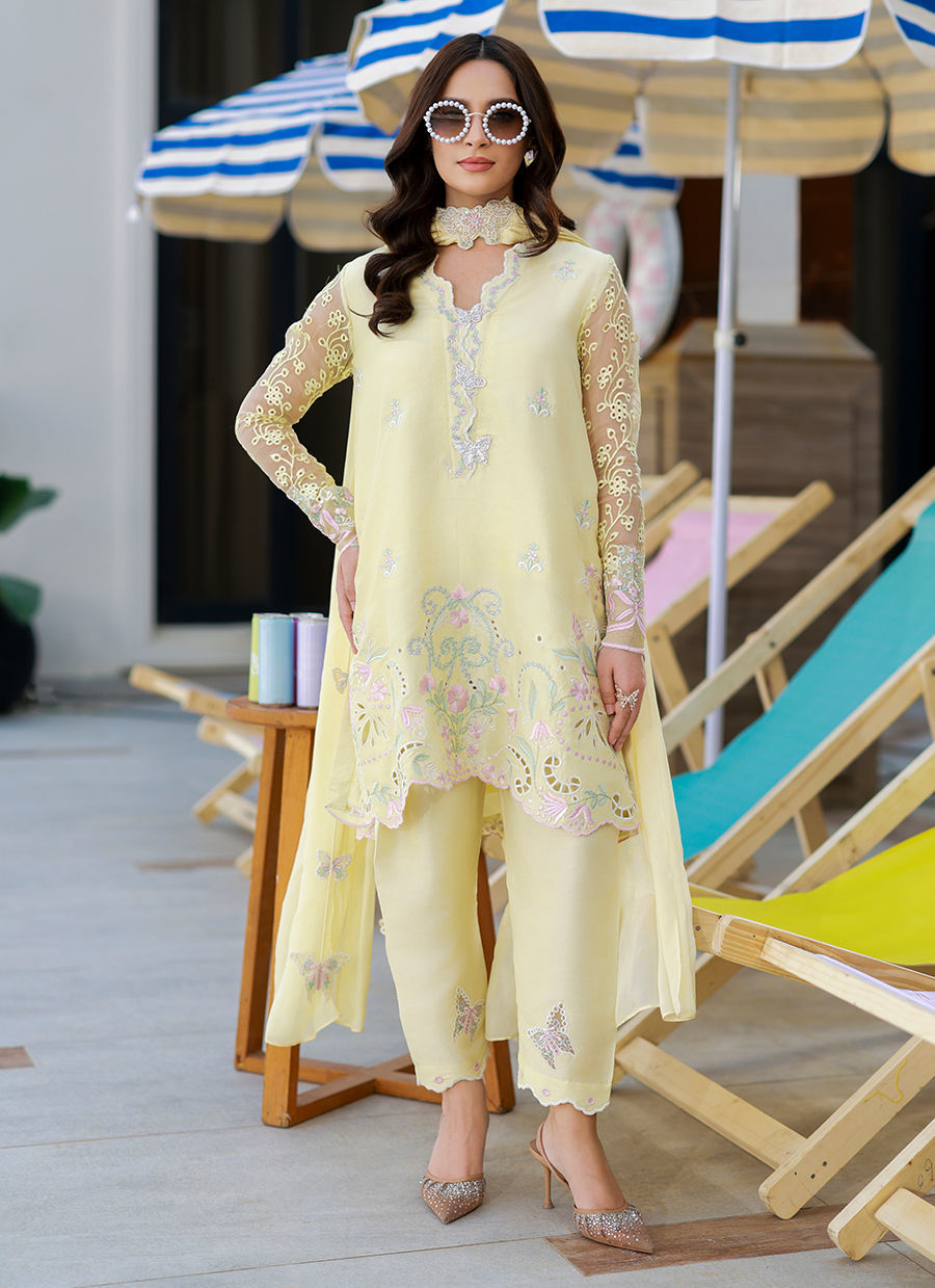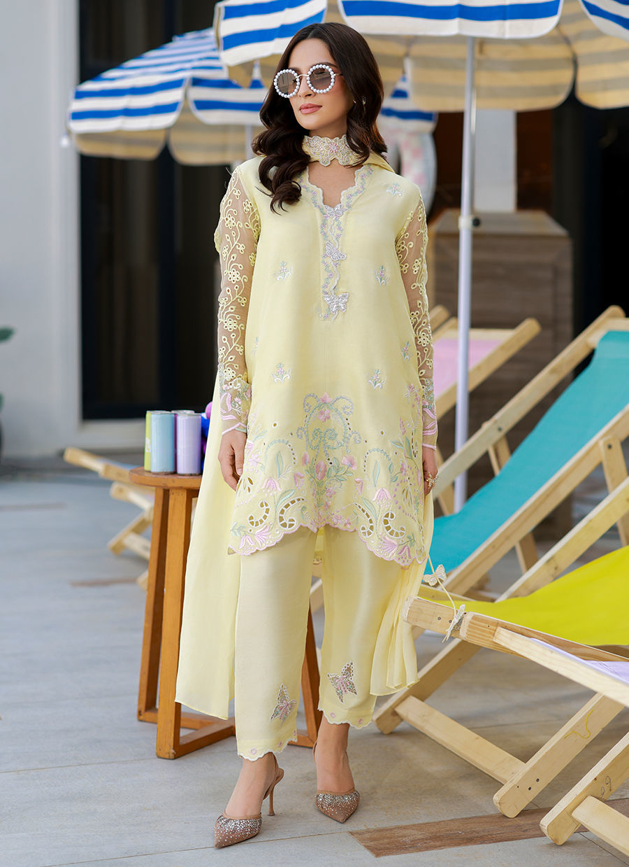 A butter-yellow raw silk short shirt paired with a matching shalwar, delicately adorned with pastel resham embroidery combined with schiffli detailing and butterfly embellishments along the neckline. The organza cutwork sleeves are further enhanced with fine resham embroidery. Finished with a Scandinavian-inspired dupatta, styled with an embellished brooch and butterfly tassels cascading from both sides of the pallu—creating a fun, youthful, and visually pleasing Eid look.