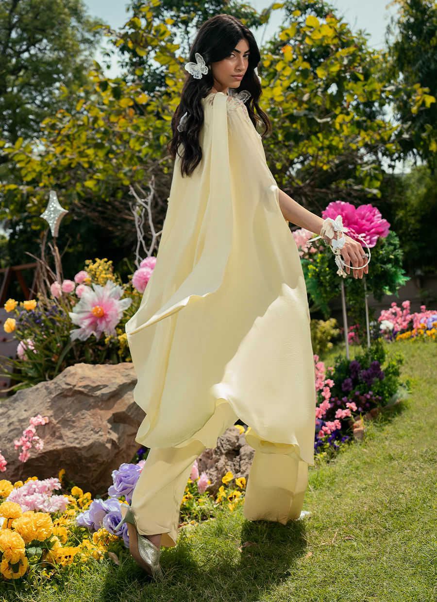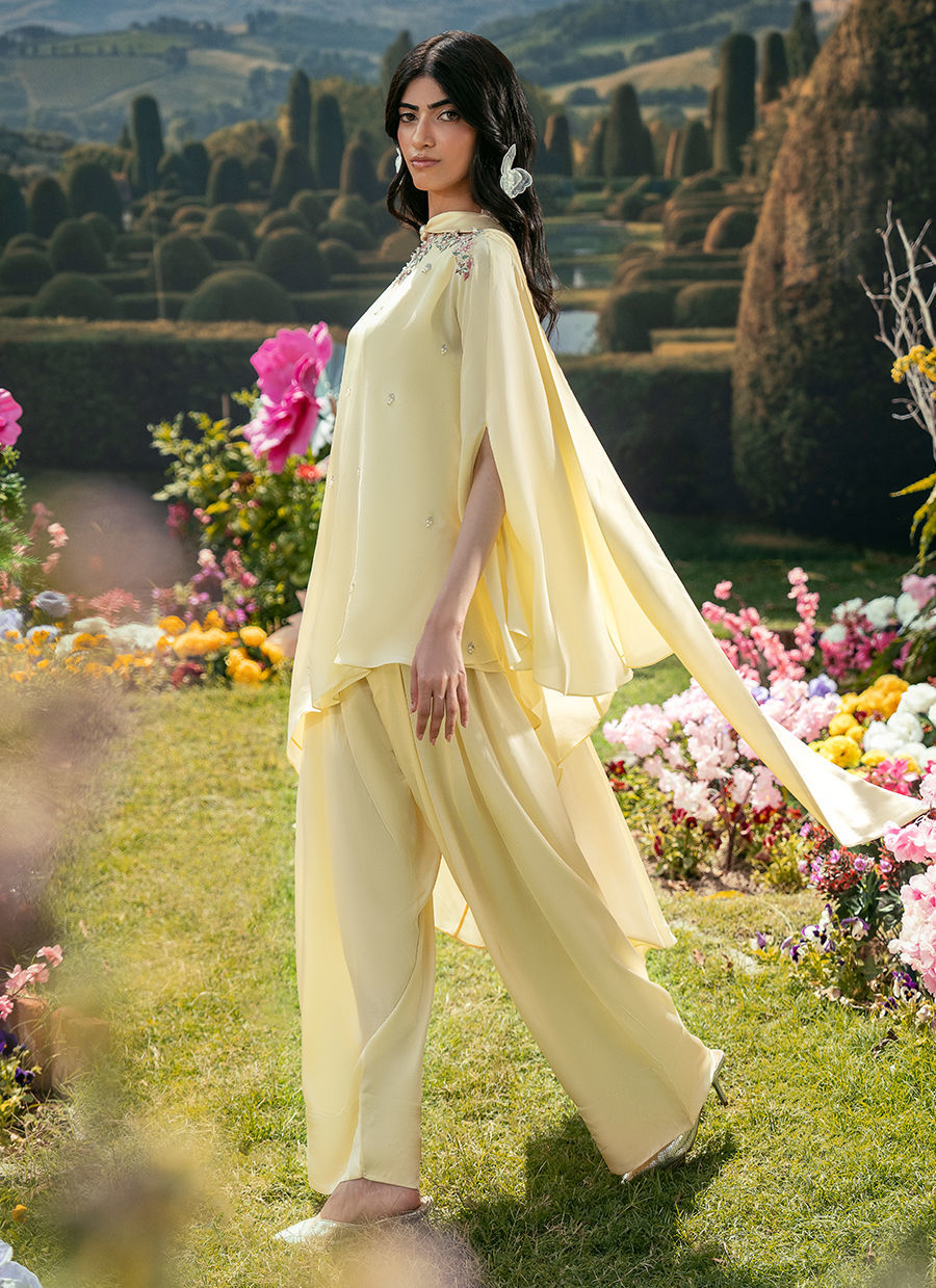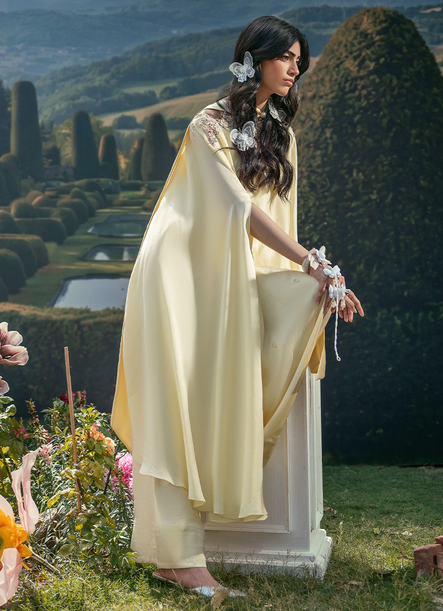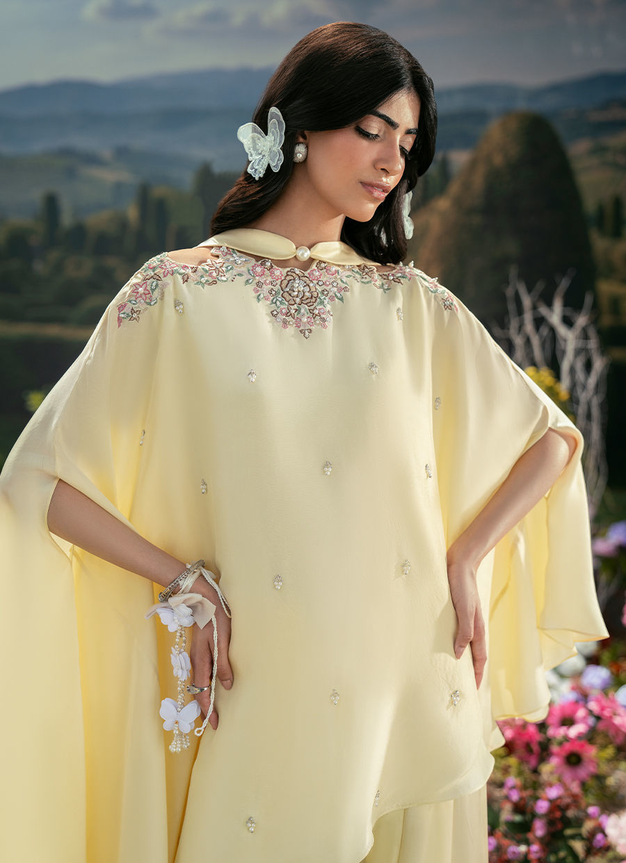 A soft butter yellow hue, features a graceful cape-style shirt detailed with delicate motifs along the neckline and subtle hand embellishments that add a refined artisanal touch. It is paired with a Scandinavian scarf adorned with a pearl accent, lending a hint of modern elegance, and completed with a classic Farsi shalwar that grounds the look in timeless sophistication.