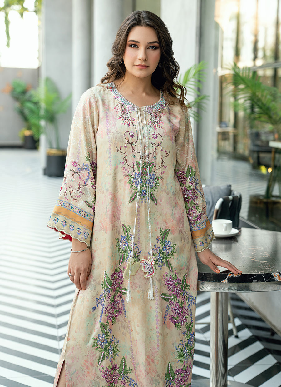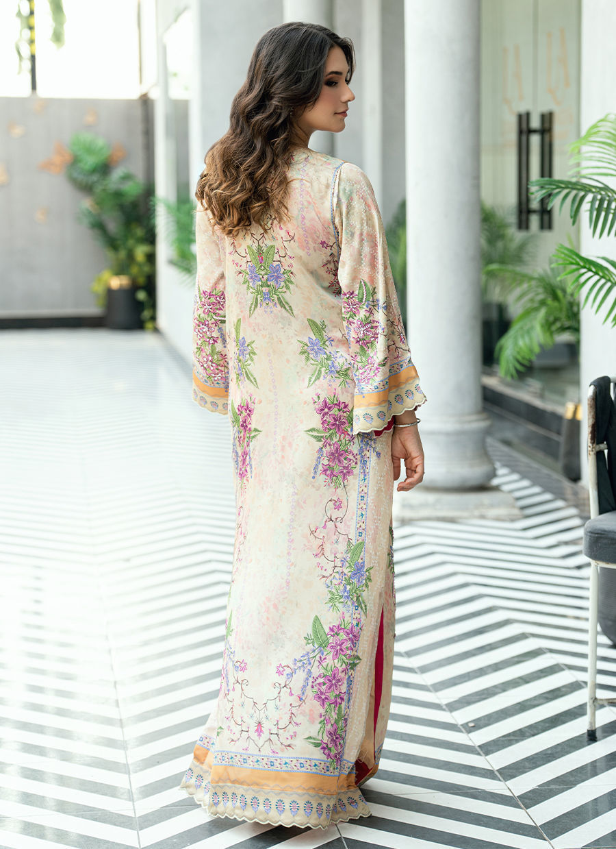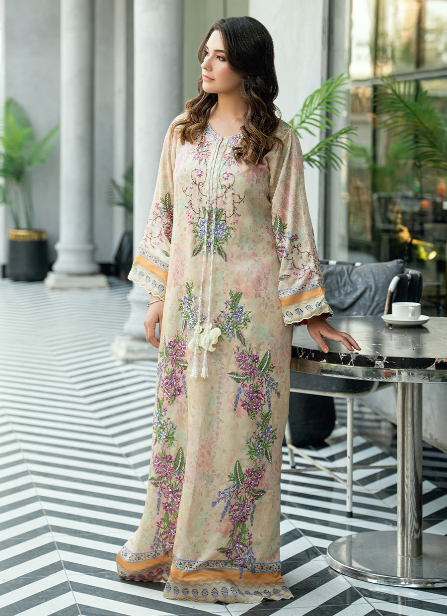 This graceful kaftan is designed on a soft beige–peach base, beautifully brought to life with a delicate digital floral print in harmonious shades of lavender, lilac, soft purple, blush pink, muted rose, sage green, and hints of soft blue. The color palette feels warm, romantic, and soothing—perfectly balanced for refined daywear.