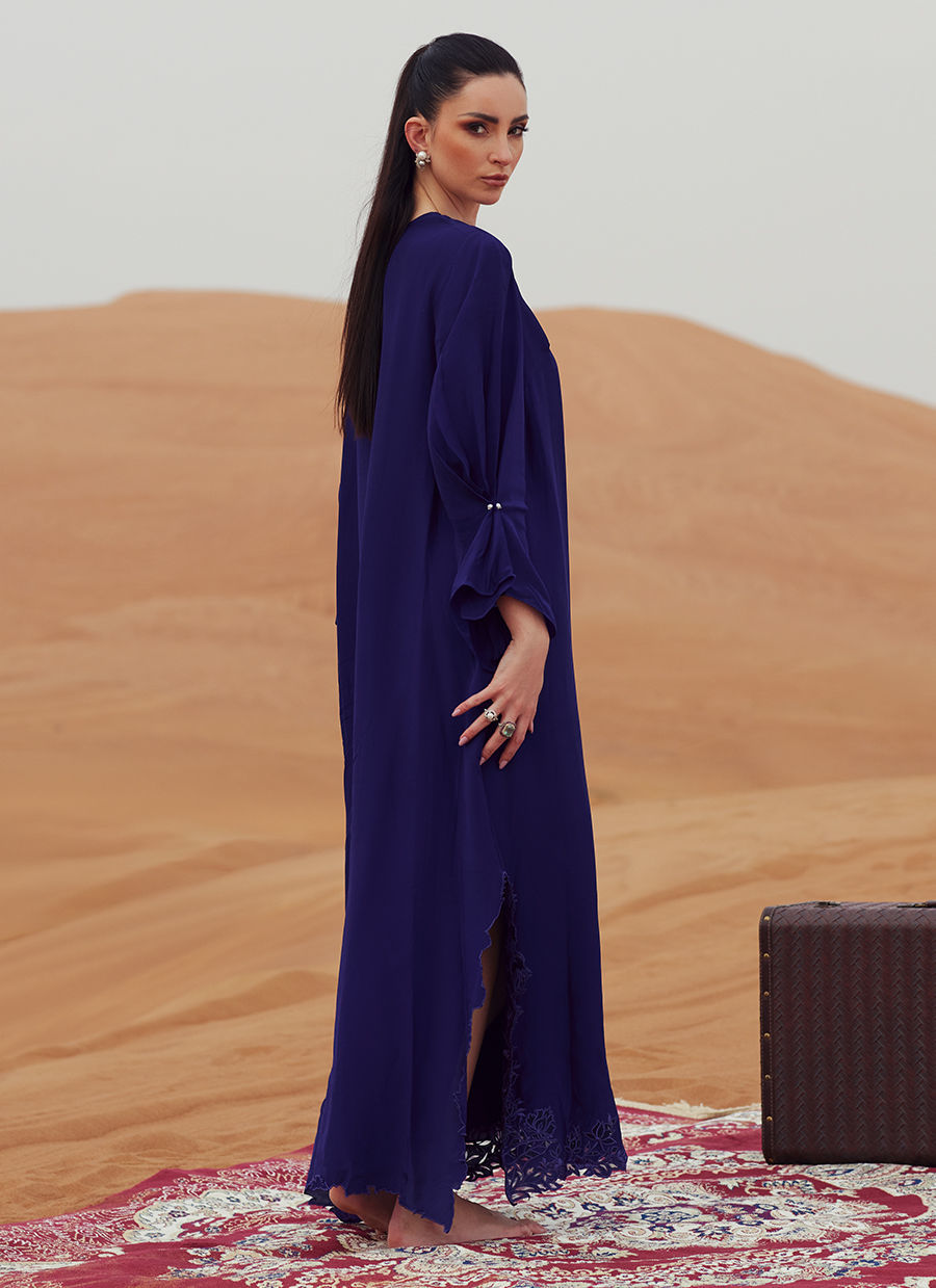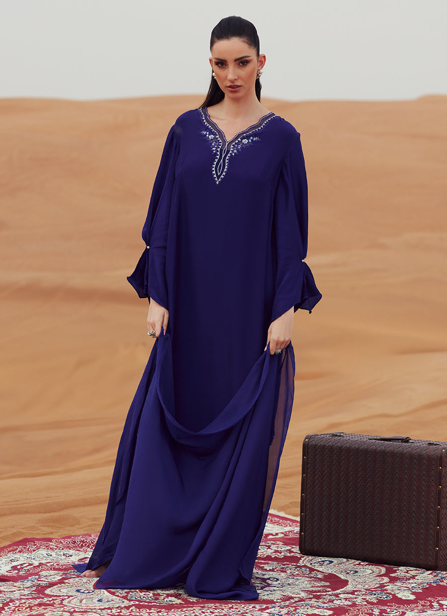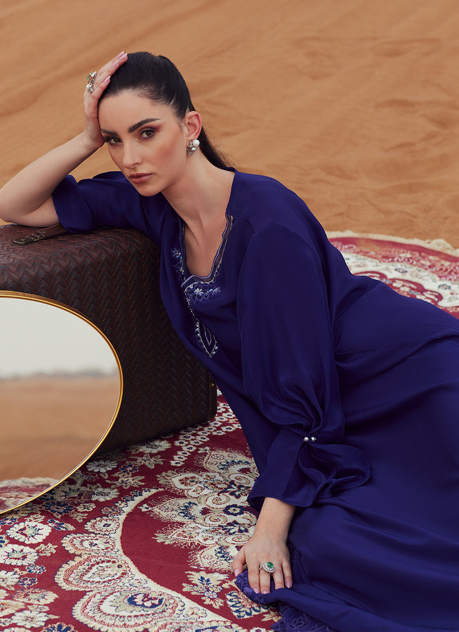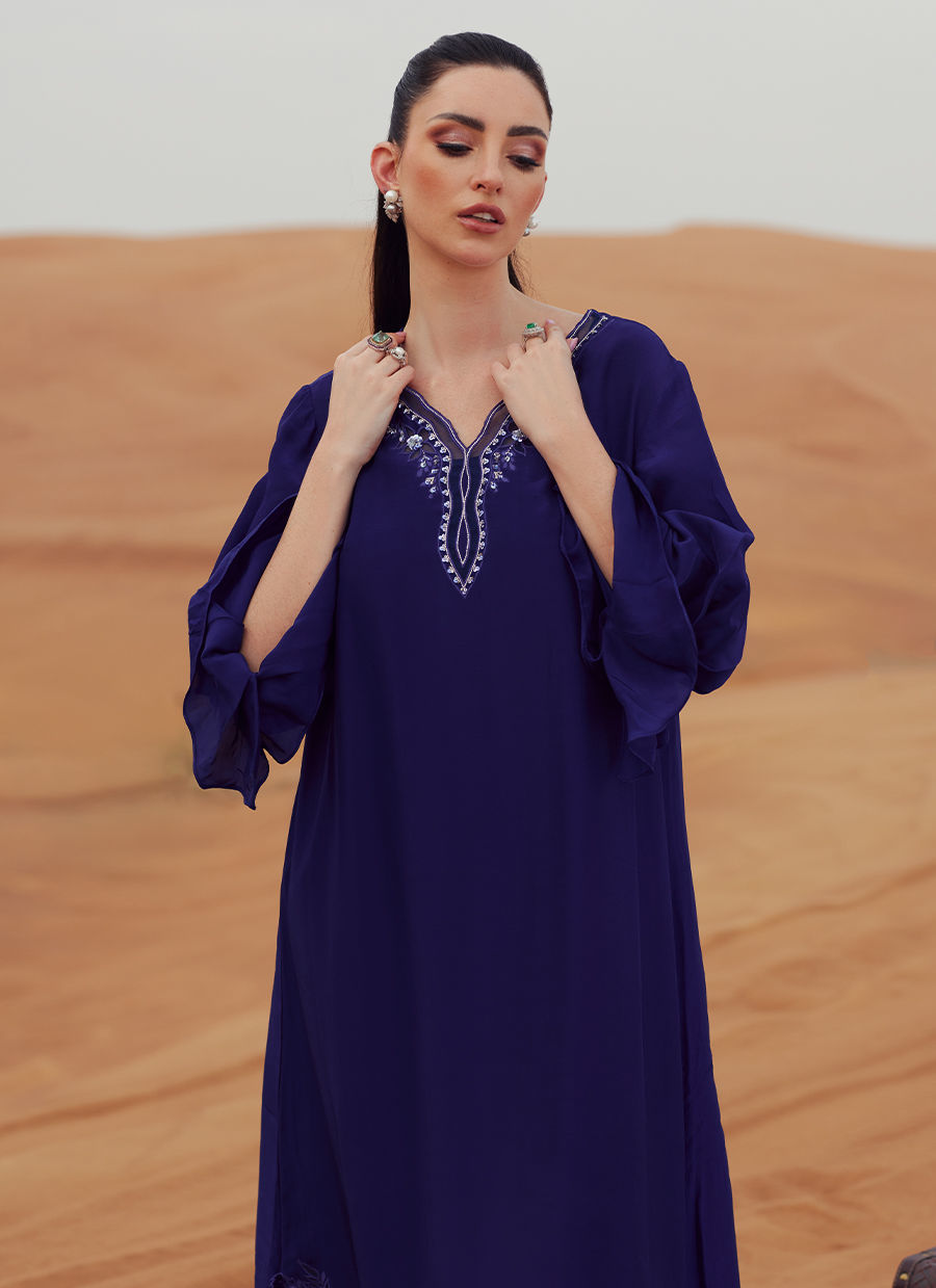A kaftan-style shirt in Korean silk, detailed with intricate embroidery and subtle embellishments on the neckline and daman. Pleated sleeve accents add structure and sophistication. Styled with tailored Korean silk cigarette pants and finished with a lightweight KP silk scarf for a polished, contemporary look.