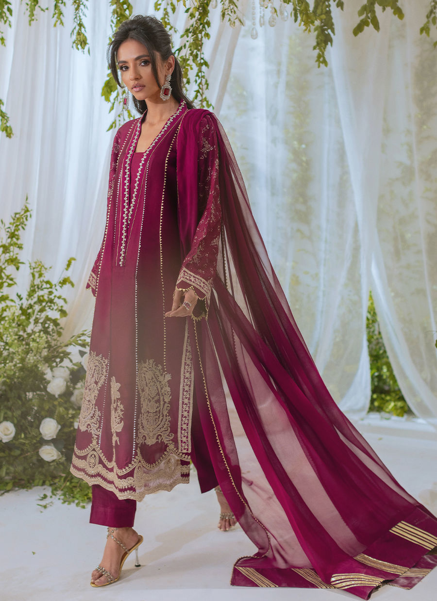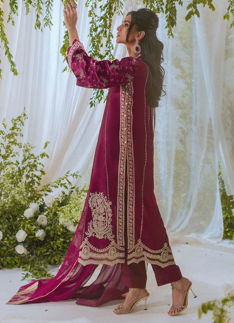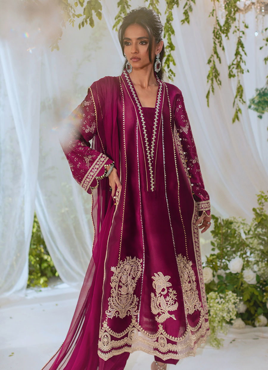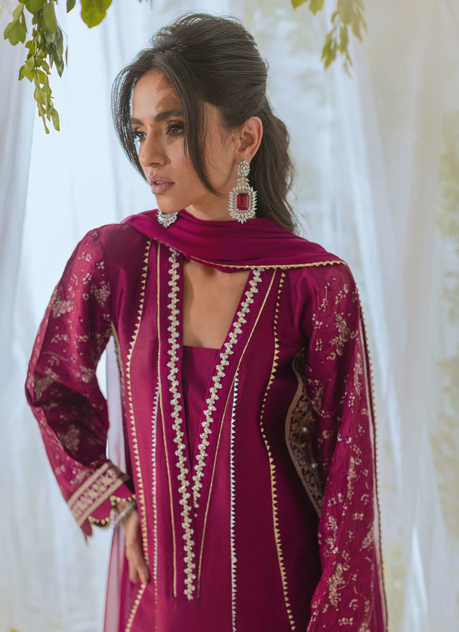 A cranberry A-line shirt made of shisha silk with a handcrafted overlapping neckline embellished with pearls and crystals. The hem is decorated with zari appliqué details. Paired with straight pants and a chiffon dupatta for a stunning festive look.