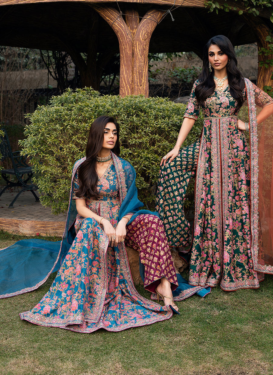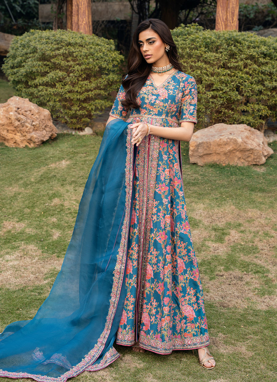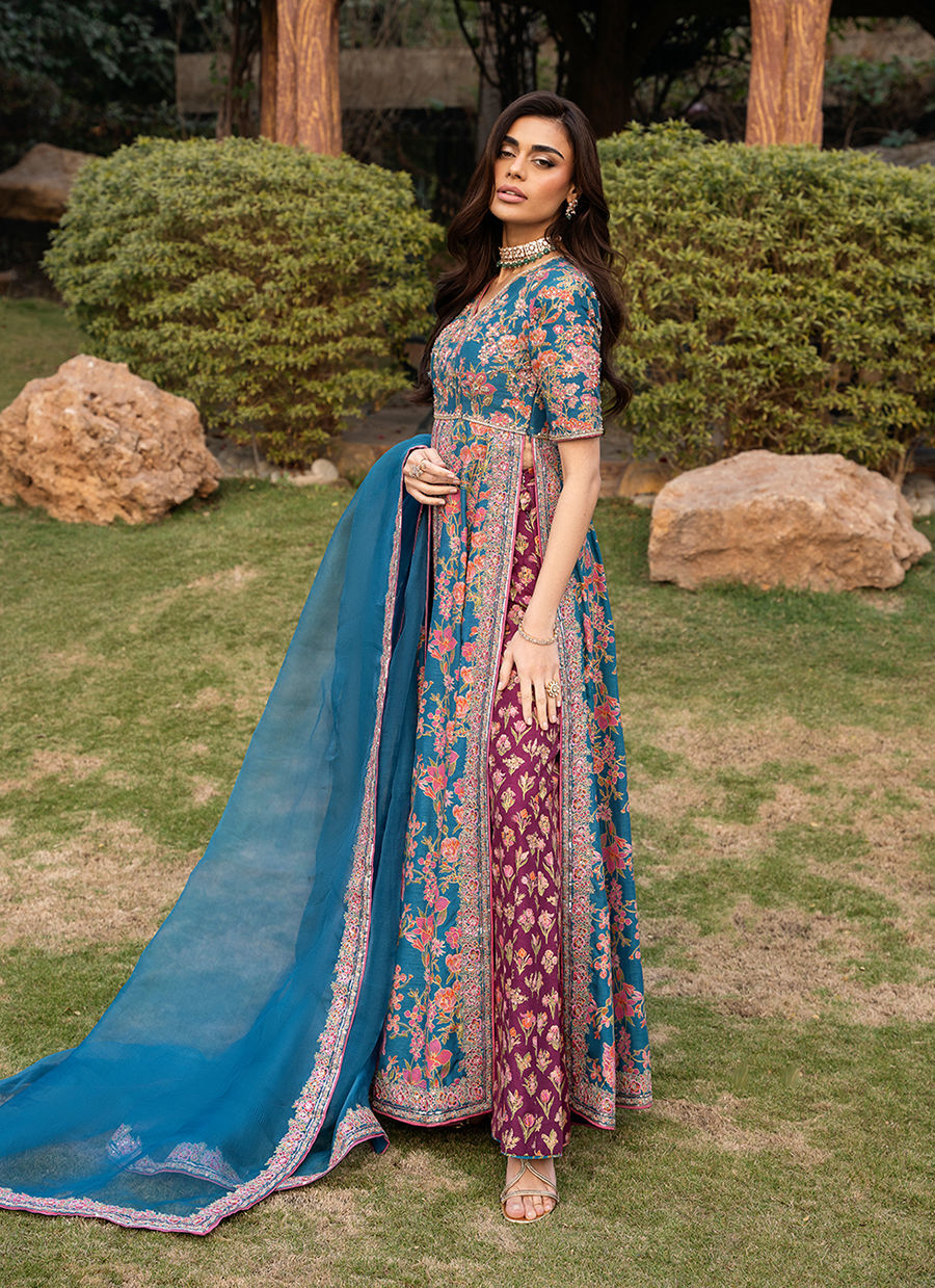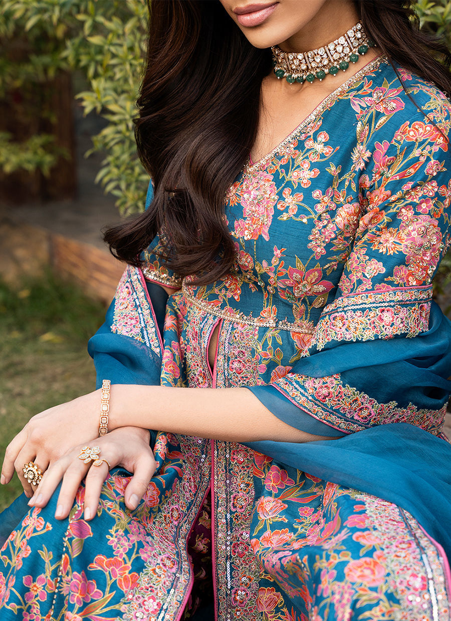 This stunning front-open screen printed kalidar is designed in a rich blue color. The kalidar features beautifully detailed embroidery along the neckline, bodice, and flowing panels, enhanced with delicate hand embellishments that add a luxurious, artisanal touch. It is paired with accent color screen printed pants crafted from premium Korean raw silk, offering a smooth texture and refined structure for all-day comfort. Completing the ensemble is a sheer organza dupatta, finished with finely embroidered borders that elevate the overall look with subtle sophistication.