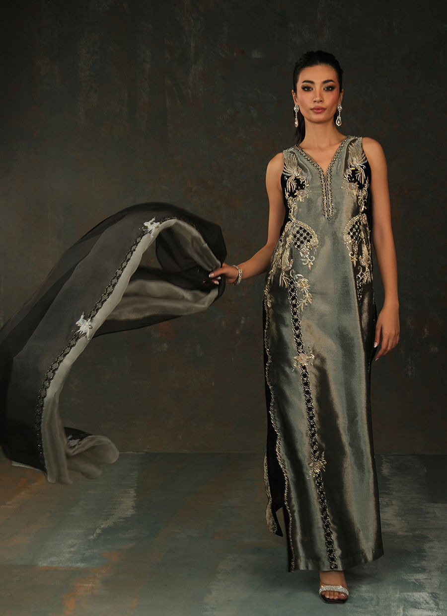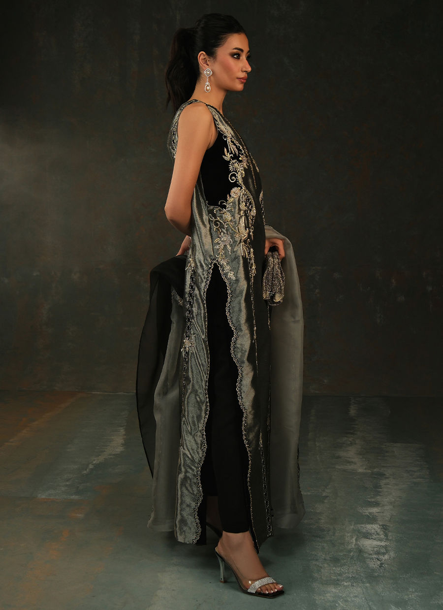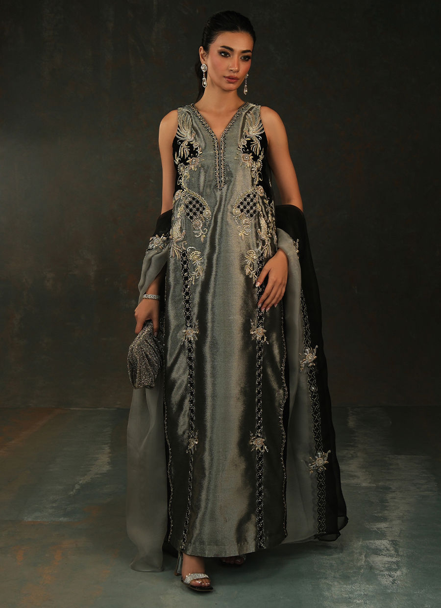 Color: Silver And Black Fabric: Tissue And Velvet Work Details: Embroidered And Embellished