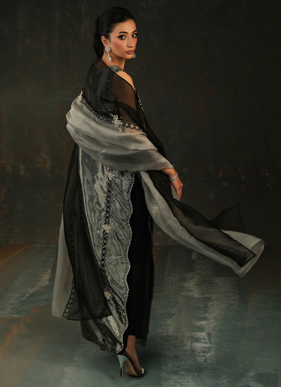 A statement in celestial grandeur, this silhouette pairs luminous silver tissue with deep black velvet, adorned in exquisite hand-worked tilla, dabka, cutwork and resham embroidery. Finished with an embroidered organza, two toned dupatta, the look blends old-world craftsmanship with a modern, sculptural form. Comes with pants.