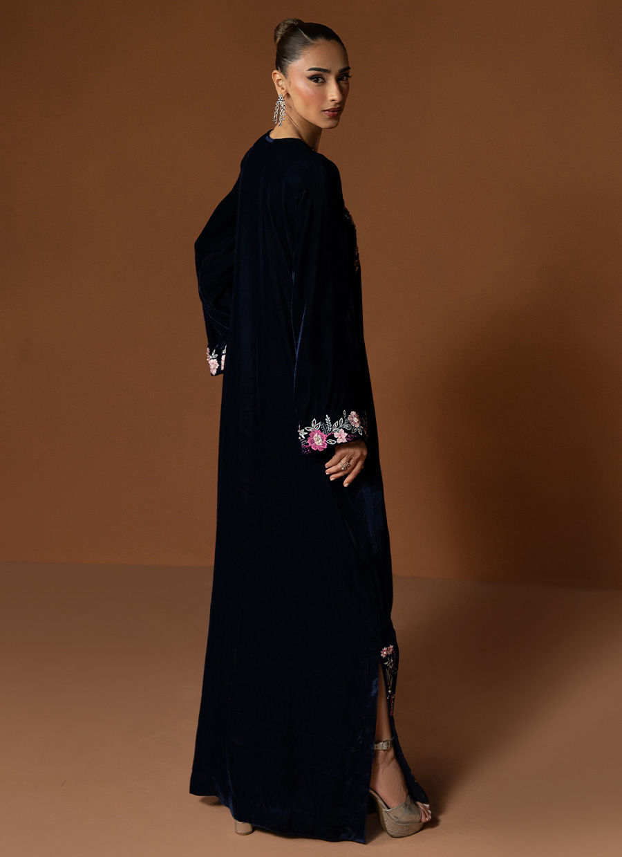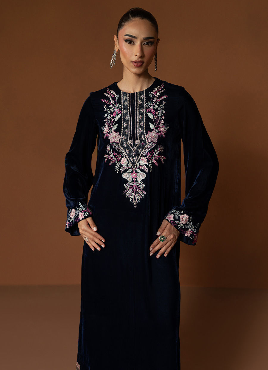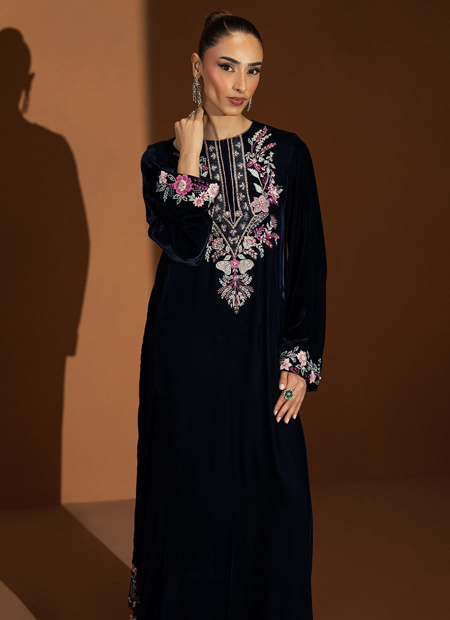 Celise captures the true spirit of Velvet season elegance in an enchanting navy blue hue. The straight velvet shirt is adorned with intricate detailing along the neckline and cuffs, showcasing refined craftsmanship and subtle artistry. Paired with sleek straight pants, this outfit embodies a balance of poise and sophistication, a timeless look that radiates grace and effortless charm, perfect for elevating your festive evenings.