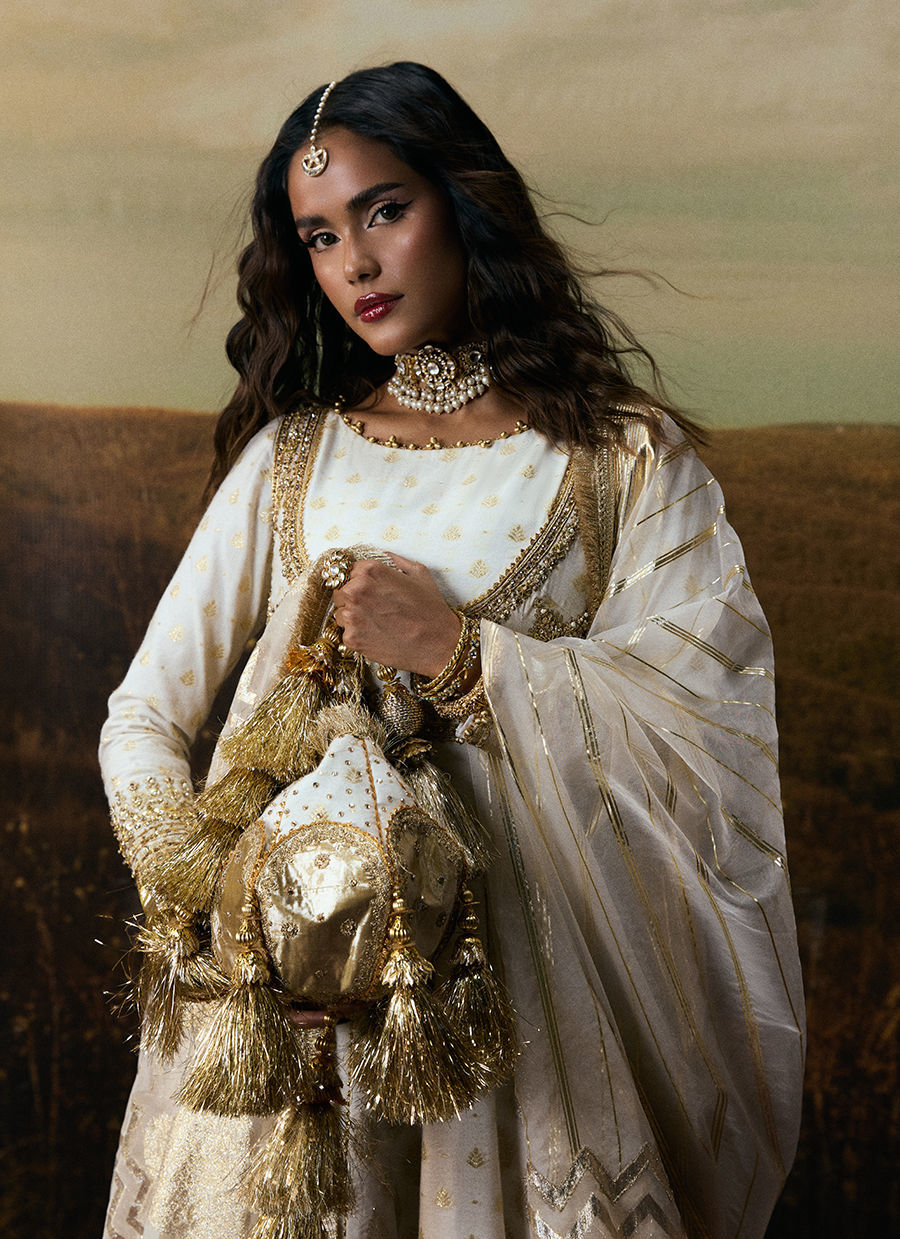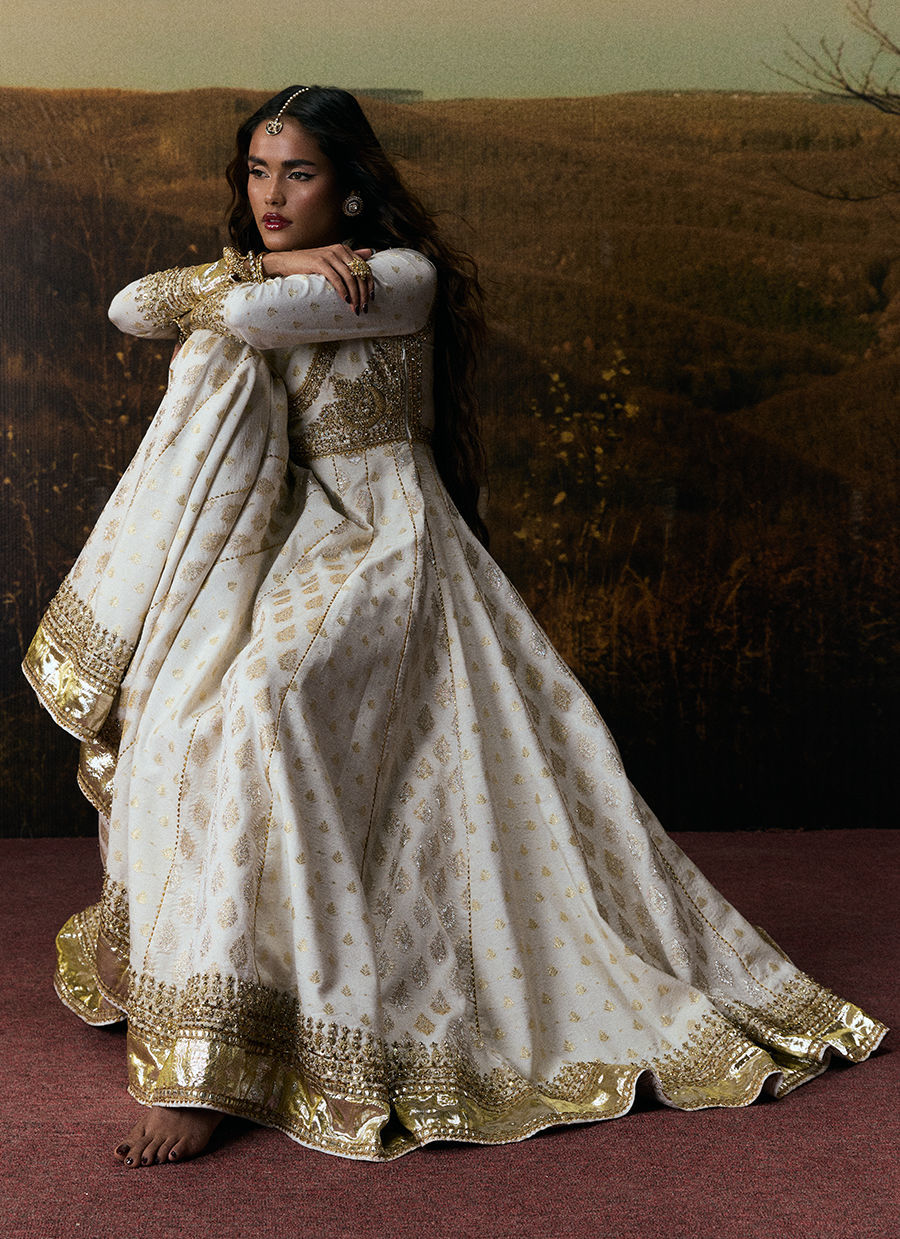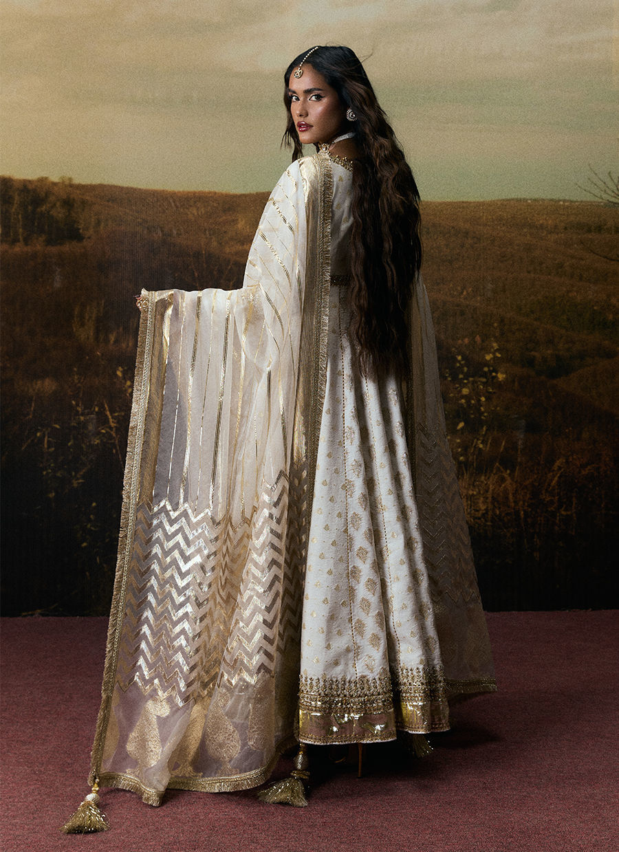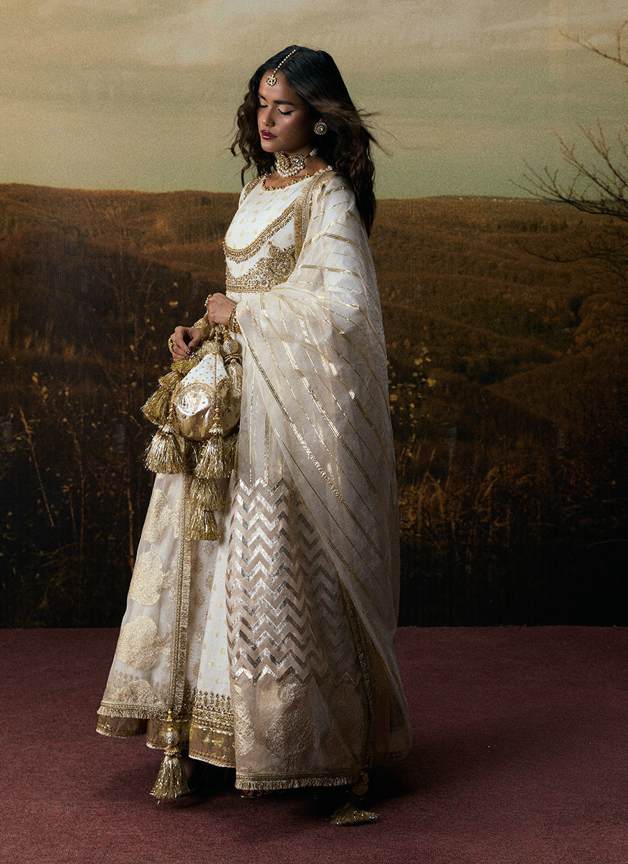 An elegant white peshwas featuring intricate adda embroidery on the bodice, finished with a graceful lappa and distinctive borders along the hem. Paired with a classic churidar detailed with crushed gota, and complemented by a dupatta crafted in varied organza patterns for a soft, ethereal finish.