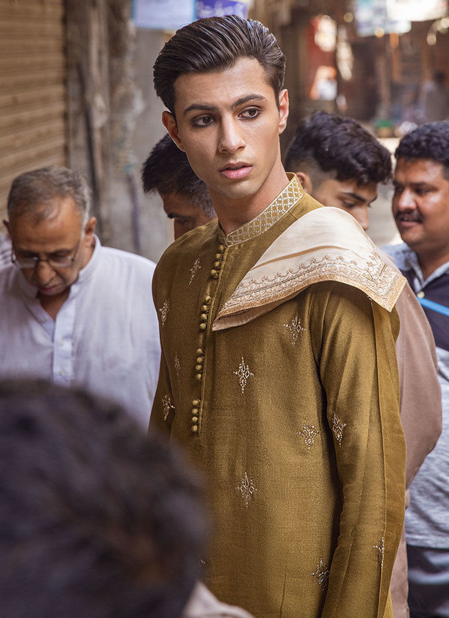 Chandun, a delicate spray of chandi kundan illuminates the mehndi green cotton net base. The collar band is decorated in a hand laid pattern of Kamdani. Comes with lined and fused cotton net trousers.