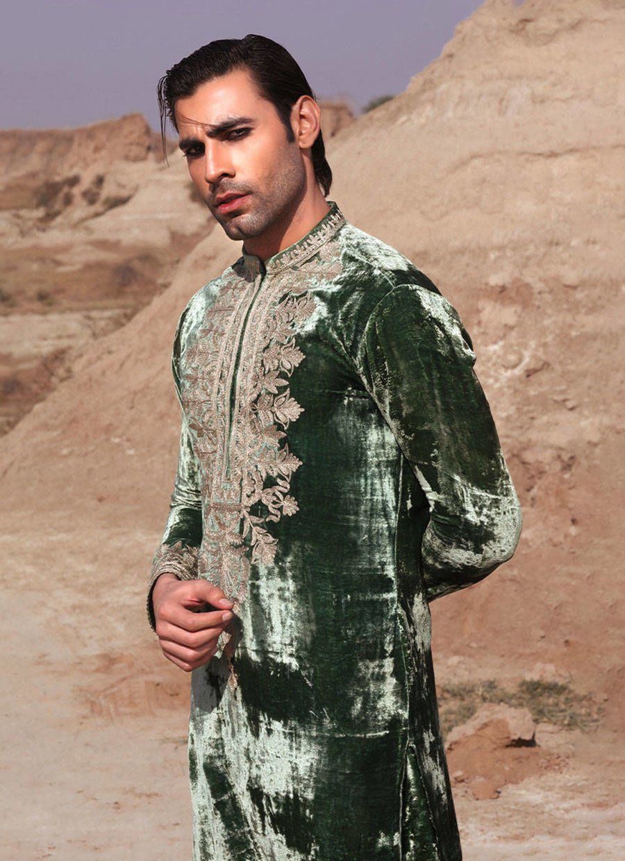 Model Zahib is wearing a luxurious velvet co-ord kameez and shalwar in emerald green. The Kameez is lavishly decorated with gilded embroidery across the chest and around the sleeve cuffs. It is paired with coord slimmed down velvet shalwar for an opulent look.