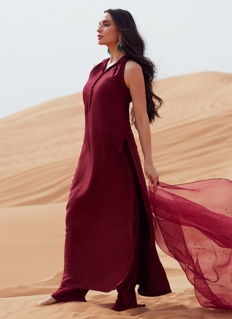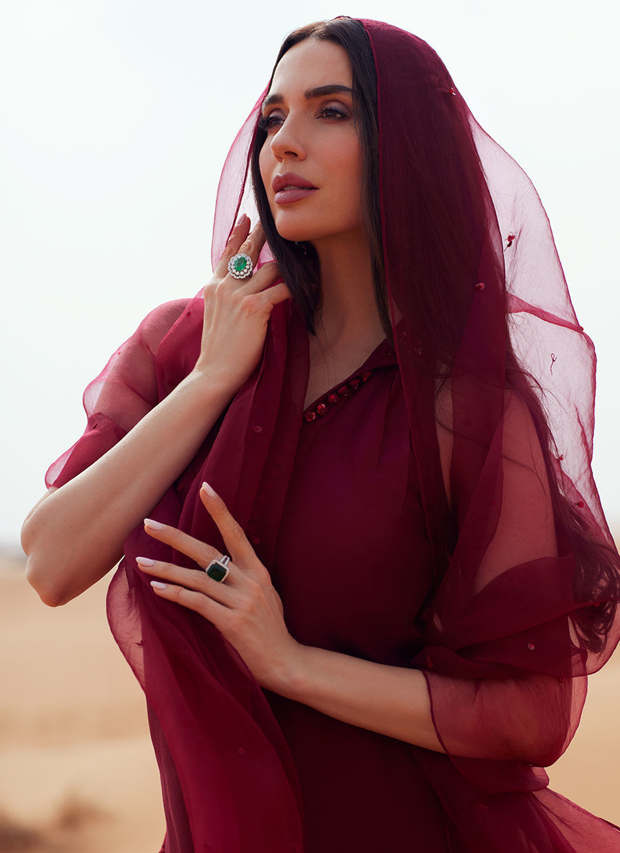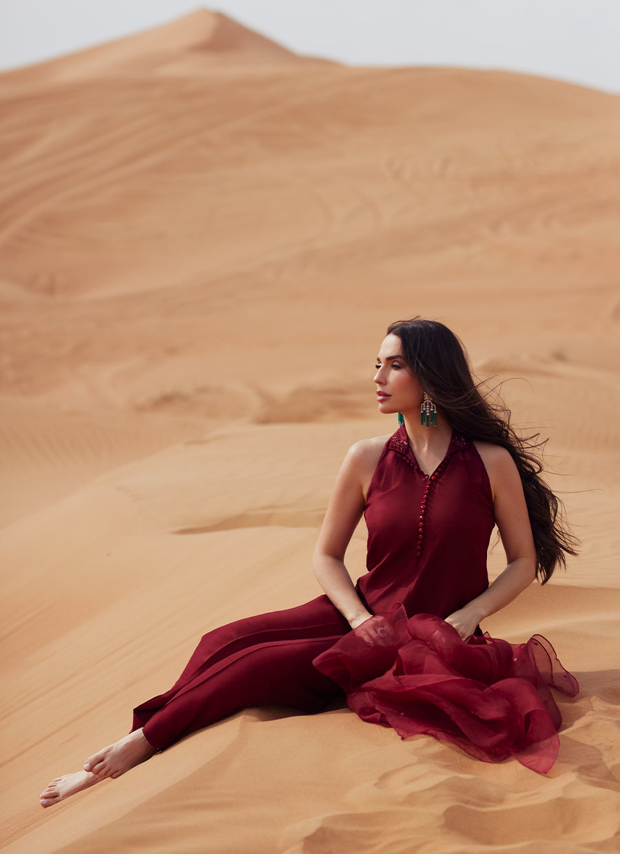 A timeless long straight shirt crafted in luxurious Korean silk, designed with refined collar detailing and a delicately pleated neckline. The front is elevated with elegant loop accents and statement embellished buttons, adding subtle festive charm. Paired with a sleek straight-fit trouser in matching Korean silk for a polished silhouette. The look is completed with a sheer organza dupatta, beautifully finished with a soft sequin spray that adds just the right touch of shimmer—perfect for serene Suhoor gatherings and graceful Eid celebrations.