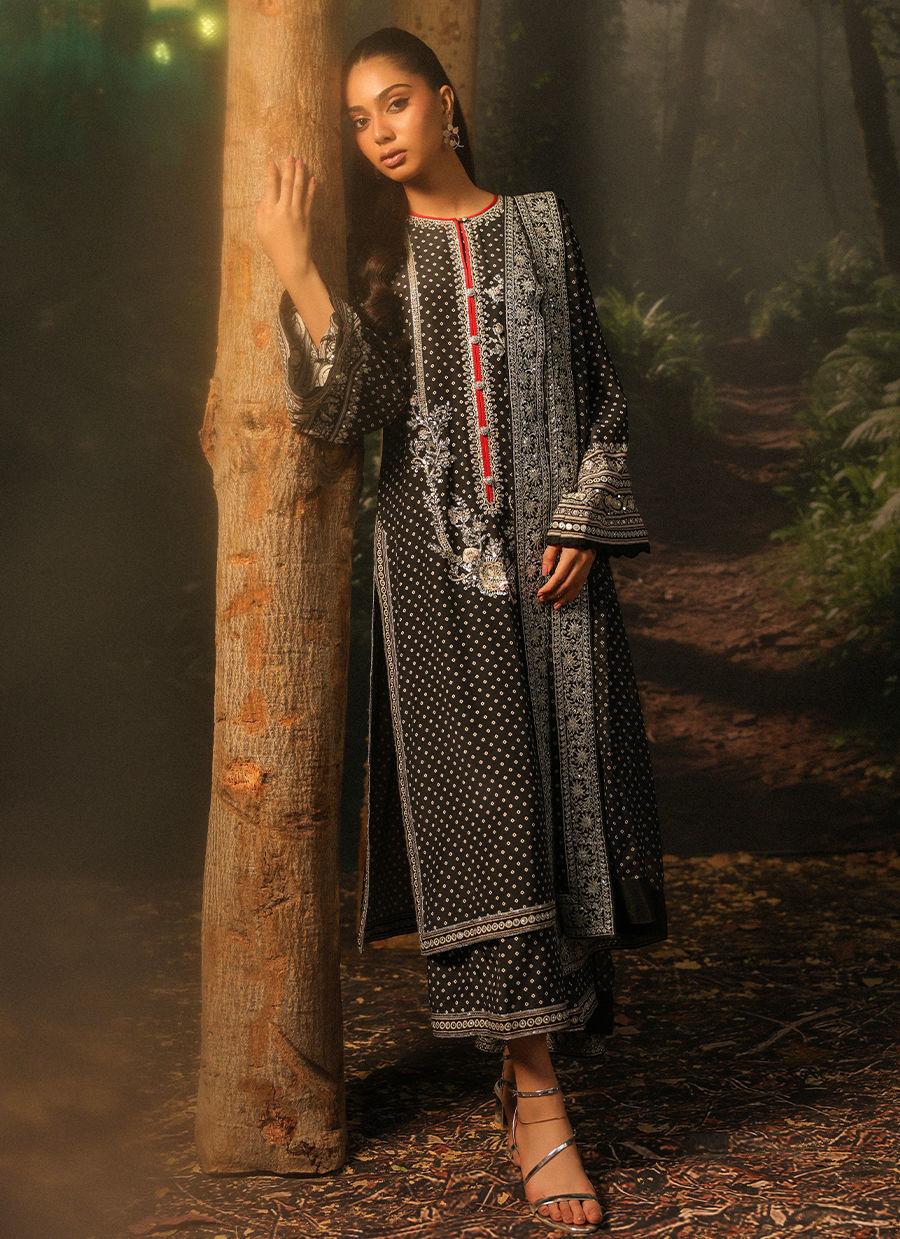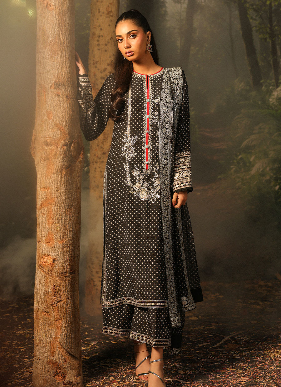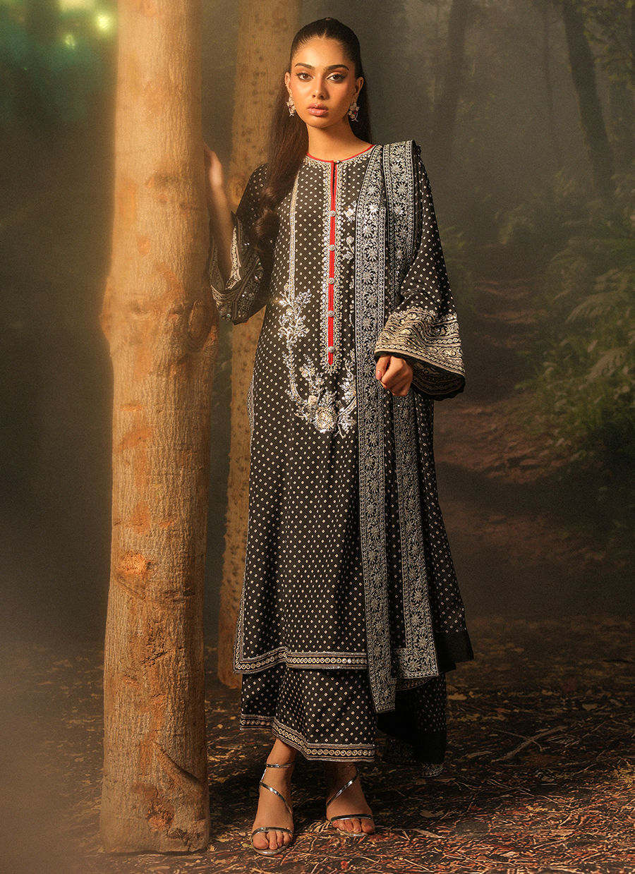 Color: Black Fabric: Shirt and Ezaar: Crepe, Dupatta: Pure Chiffon Work Details: Hand Work
